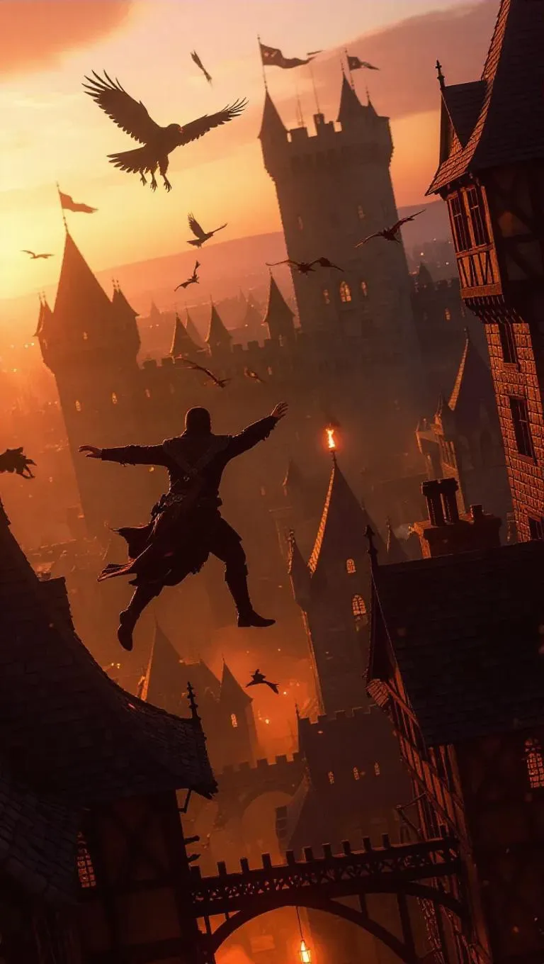 Text to ImageA daring thief leaps across ancient castle rooftops, pursued by relentless guards and flying griffins. The castle skyline glows with torches and banners, creating a vibrant, chaotic atmosphere.Recreate
