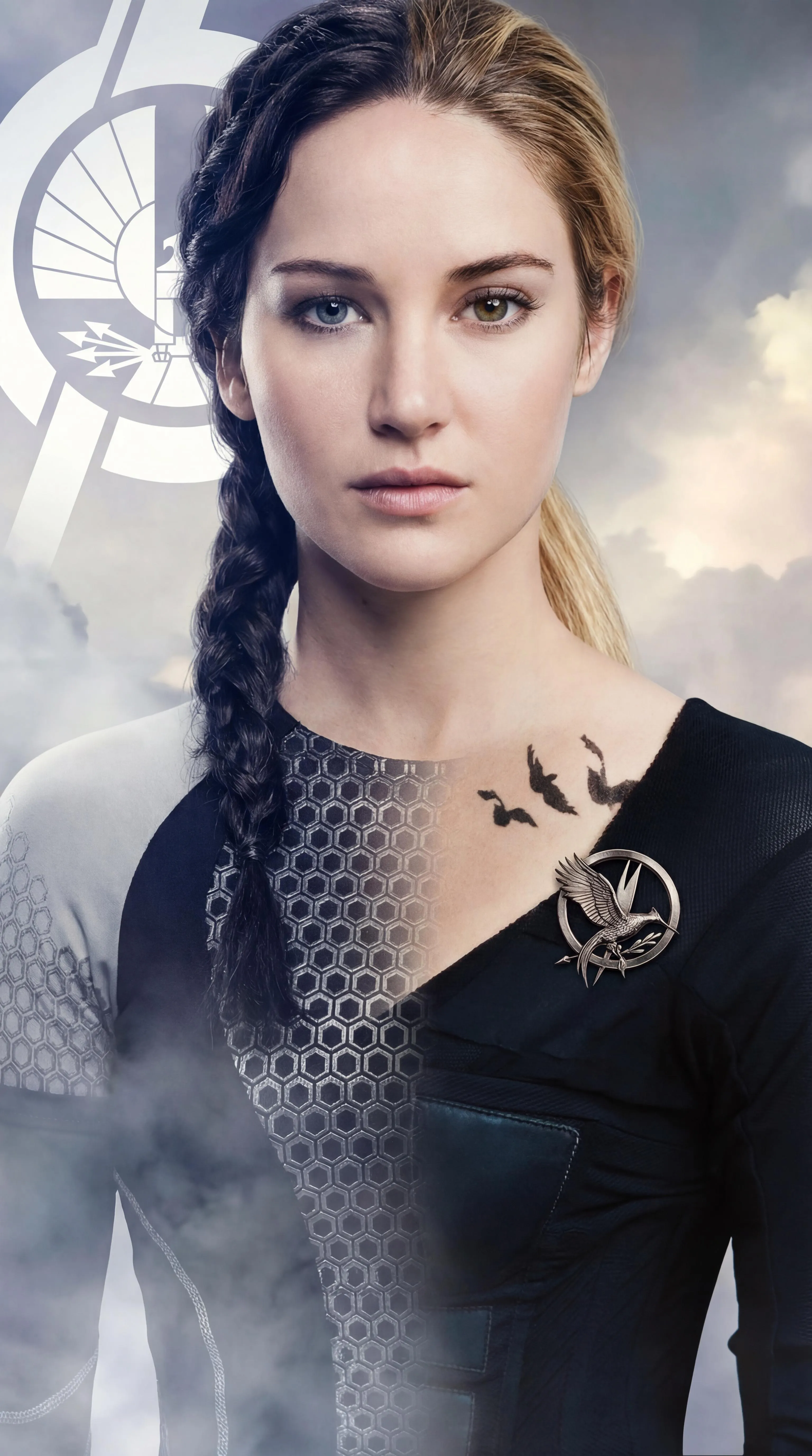 Katniss Everdeen (portrayed by Jennifer Lawrence) and Tris Prior (portrayed by Shailene Woodley) interchangeably combine into each other as one, facial and physical features alike, as do their respective outfits.