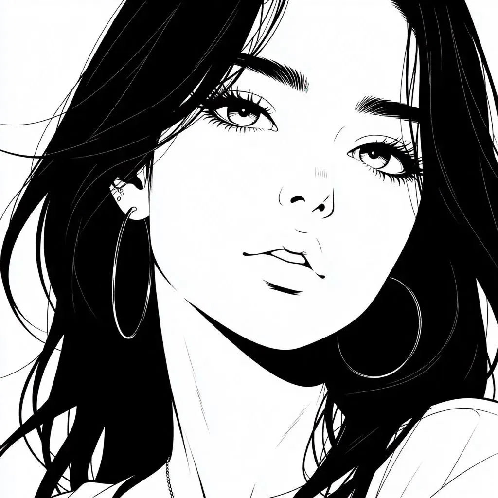 Donna sui 30 anni con un volto adatto al nome Chiara e al cognome Belella, occhi castano chiaro, capelli quasi sul biondo, disegnata in stile anime, bianco e nero, espressione serena, sfumature delicate, linee fluenti, sfondo minimalista.