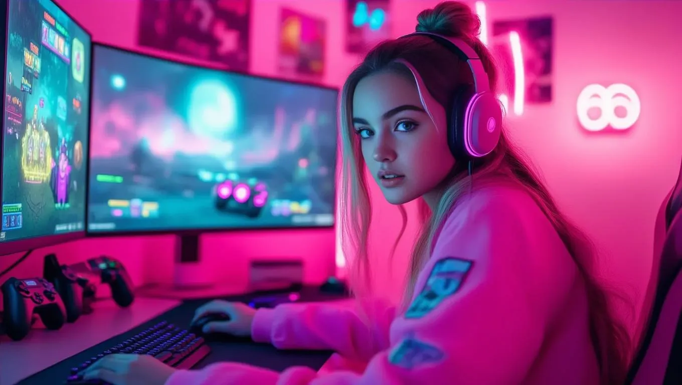 Transform your creative ideas into vibrant AI visuals of a 25-year-old American girl in pink gaming in a neon-lit room. Perfect for modern gaming content, anime-inspired scenes, and youthful digital aesthetics. Explore text-to-image AI tools for dynamic, colorful character designs and contemporary gaming setups.