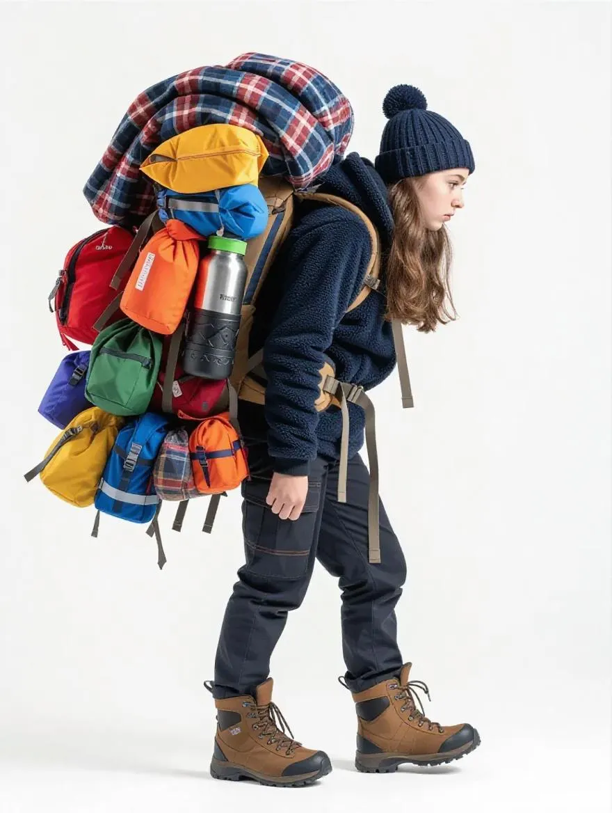 Generate AI images of overloaded kindergarten teachers with detailed hiking gear using vivago.ai. Create professional visuals featuring oversized backpacks, thermos bottles, children's jackets, and realistic strain effects. Perfect for storytelling, educational content, or social media with AI-powered precision and white-background focus.