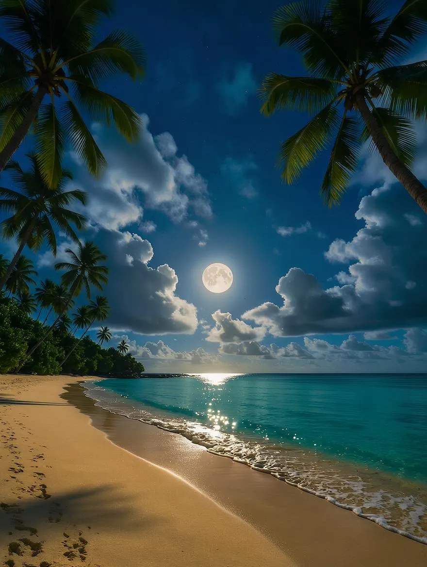 Generate a peaceful tropical beach night scene in ultra-realistic style. Features a bright full moon over calm turquoise water, shimmering moonlight path, golden sand & lush palm trees under a deep blue sky. Professional-grade ultra-realistic AI image for a serene escape. Create your tranquil tropical paradise prompt with vivago.ai. *(Word count: 56)*