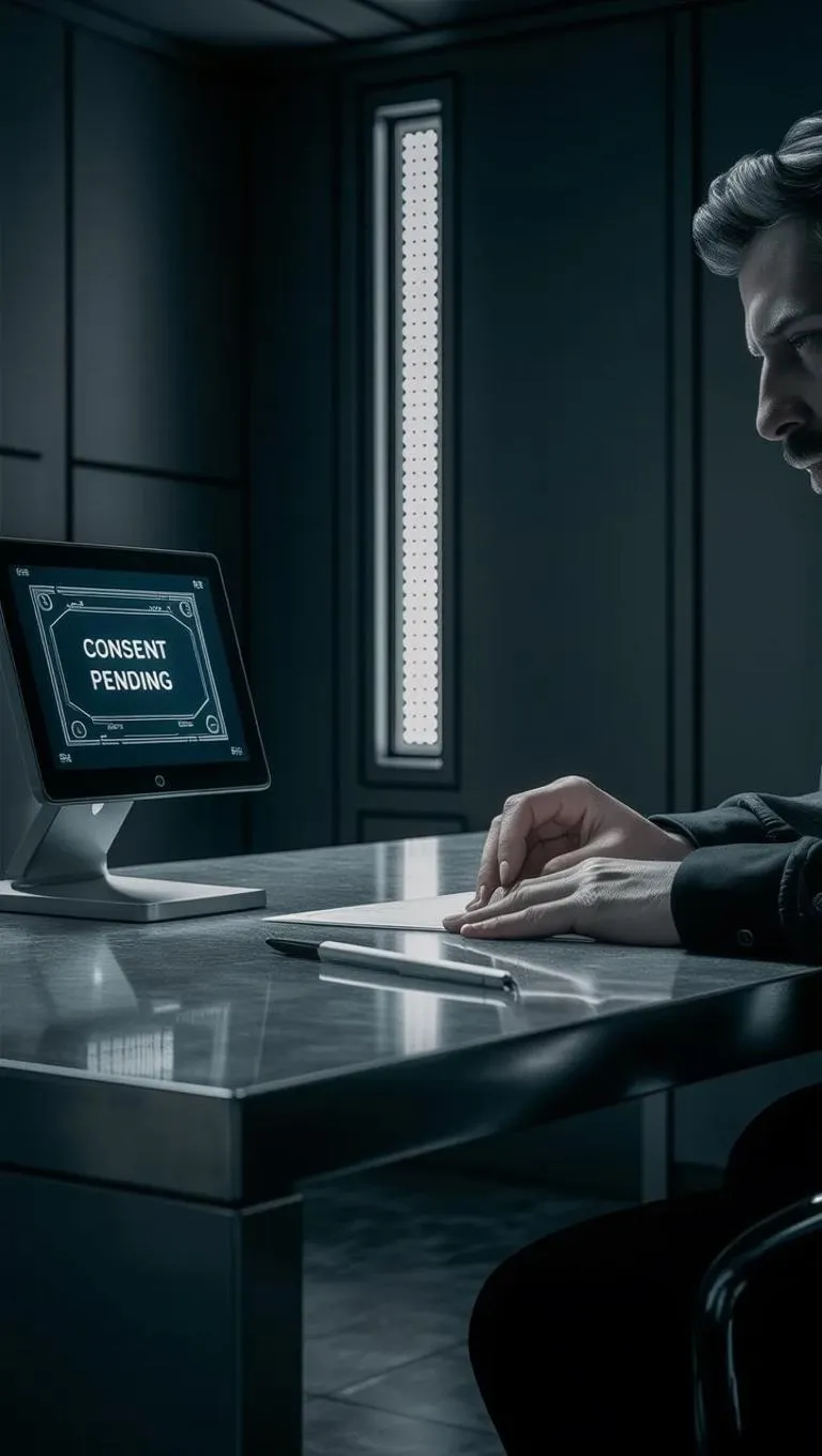 Experience a hyperrealistic AI-generated scene of a tense interrogation room. Hollywood-style cinematic details—steel desk, "Consent Pending" digital screen, clinical lighting—highlight trembling hands, skin textures, and raw emotion. Perfect for filmmakers and creators seeking social realism visuals with vivid, lifelike precision. Explore AI-powered cinematic storytelling tools for professional-grade realism.