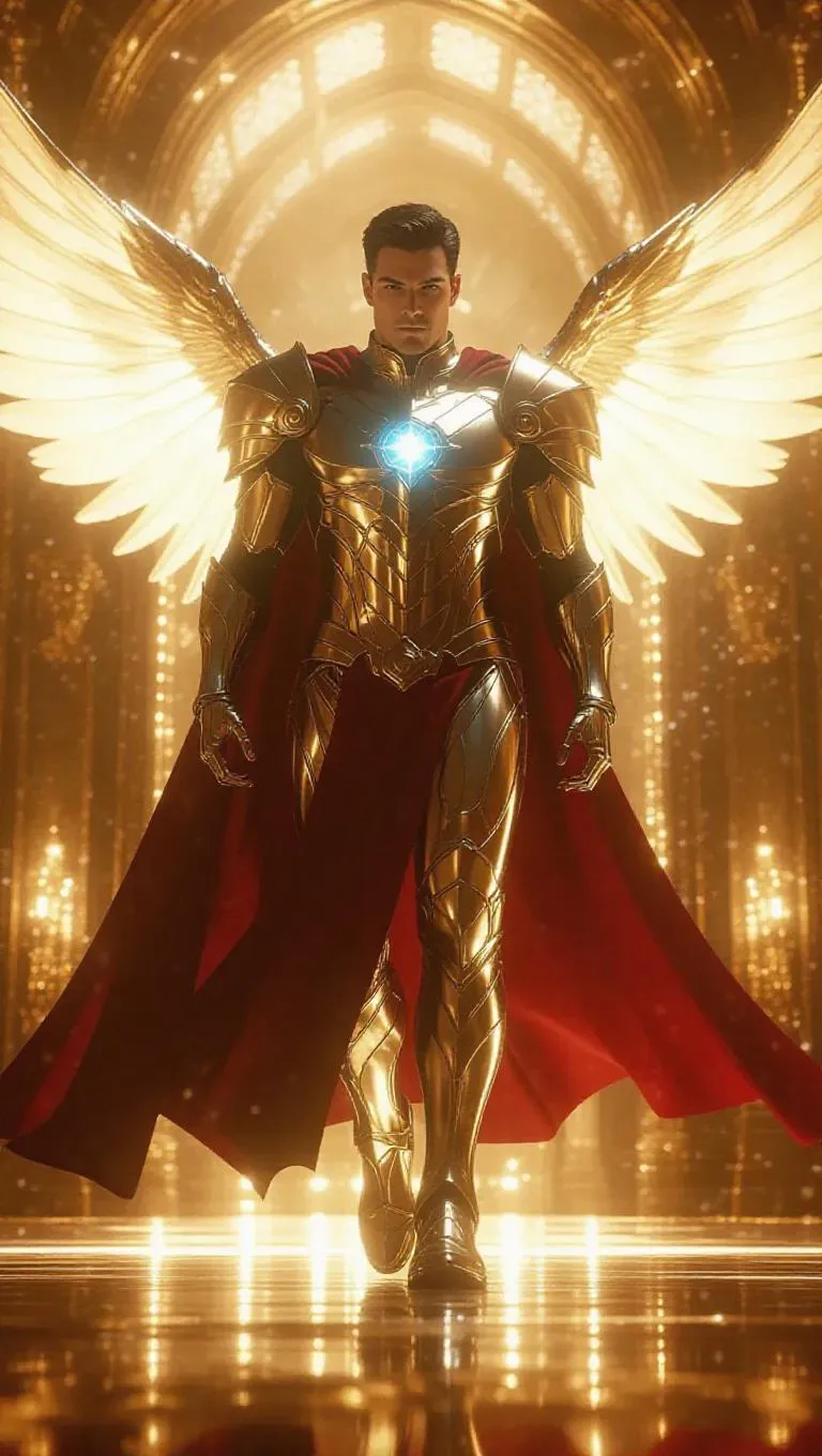 Generate a hyper-realistic 4K AI image of a towering archangel in radiant silver-gold armor with celestial runes, glowing crimson cape, and sapphire eyes traversing Heaven's golden halls. Capture divine energy, heavenly light, and celestial grandeur with vivago.ai's AI art tools for ethereal, ultra-detined visuals.