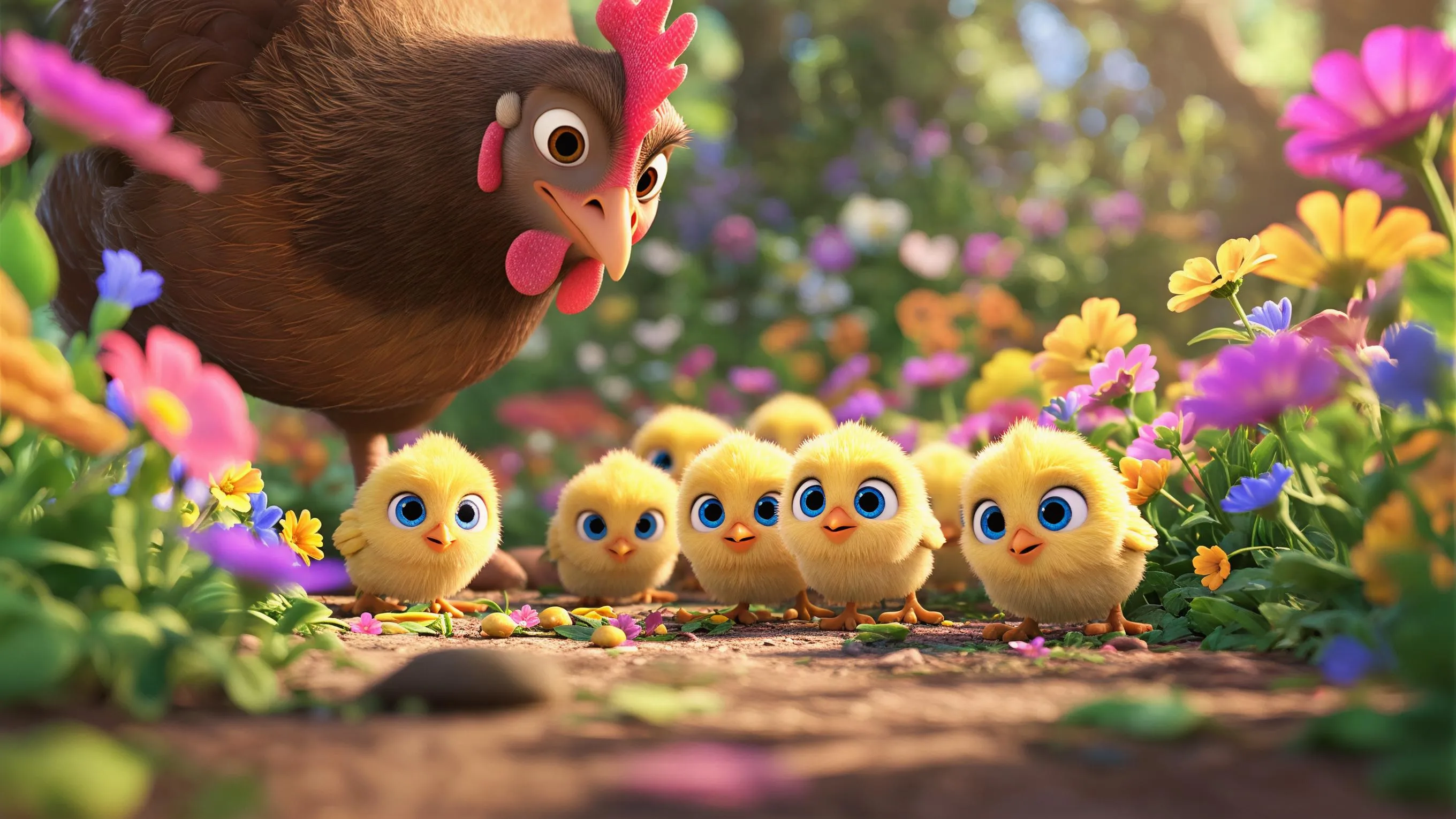 Create a magical Pixar 3D cartoon scene: Low-angle, slow-motion view of a beautiful brown hen leading fluffy yellow chicks with big blue eyes. They peck for food in a vibrant flower garden under soft lighting. Generate this gentle animated moment with professional AI tools.