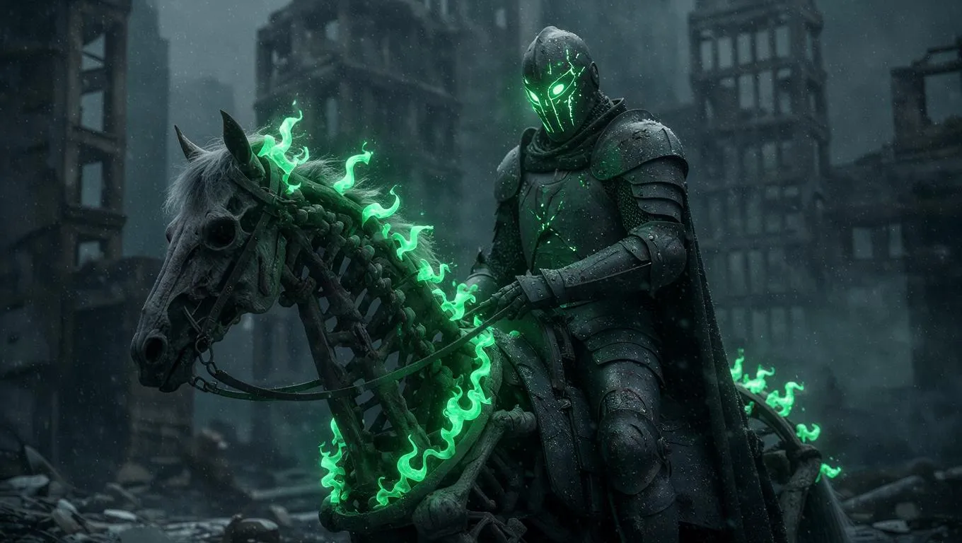 A decaying, radioactive knight in tarnished, glowing armor sits atop a skeletal horse wreathed in green, phosphorescent flame. The scene is lit by a sickly, unnatural twilight filtering through the skeletal remains of skyscrapers in a ruined city. Ash falls like snow, illuminated by the faint, toxic glow emanating from the knight and horse. Found footage style, handheld camera shakiness, interlaced lines. The knight's visor is cracked, revealing a skull with empty, glowing sockets. Close-up on the horse's exposed, radioactive bones, with tufts of decaying flesh still clinging. Geiger counter clicks and static interrupt the audio. Extreme film grain, chromatic aberration, lens distortion, and corrupted data glitches. The background is blurred, focusing on the terrifying figure. A sense of overwhelming dread and imminent doom. Focus on the knight's silent, motionless presence as a symbol of irreversible decay and environmental collapse.
