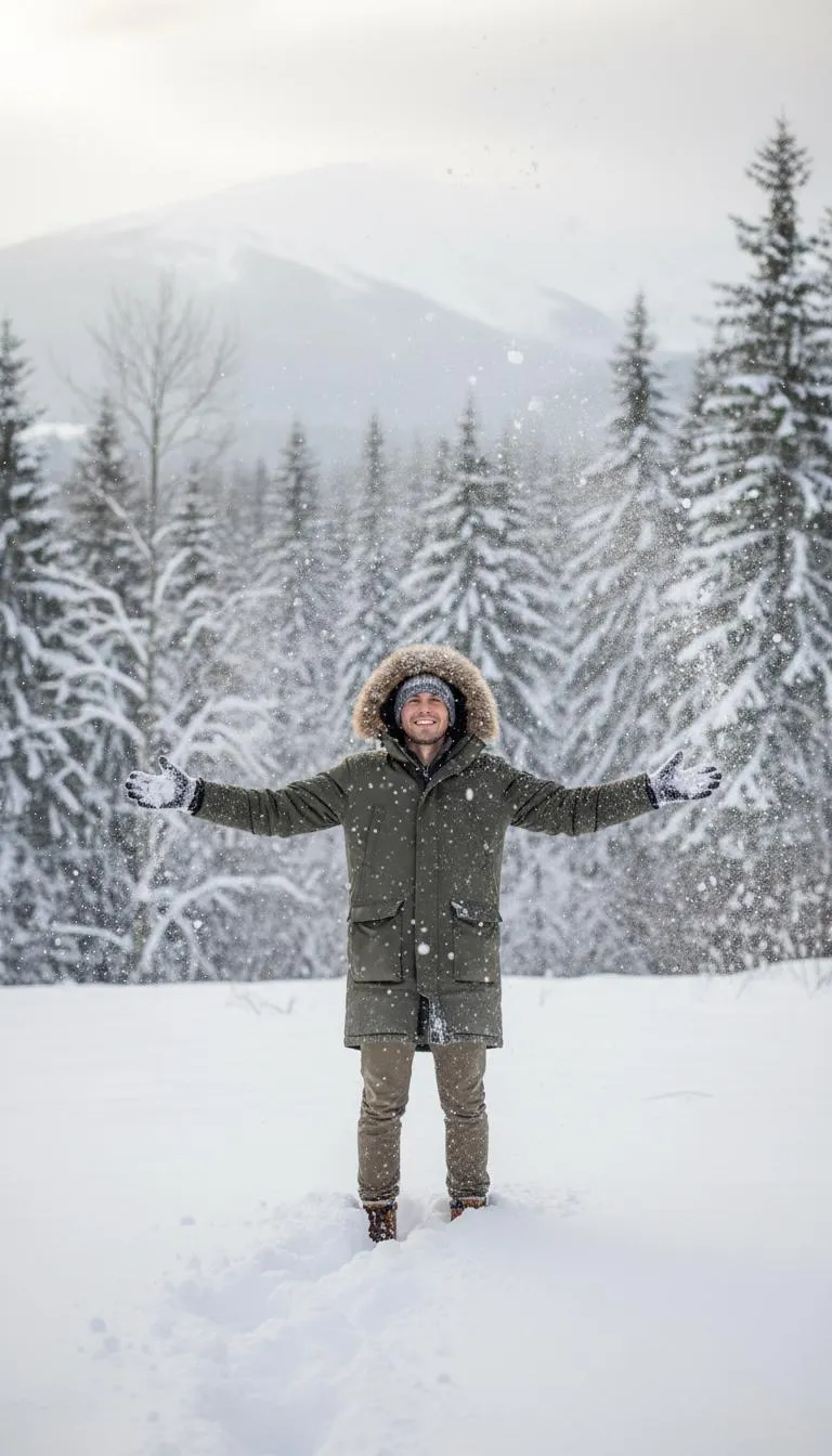 Generate stunning AI visuals of a man enjoying peaceful snowfall. Create captivating winter scenes effortlessly with vivago.ai's image generator. Transform your text prompt into a serene snowy landscape featuring a figure embracing the weather.