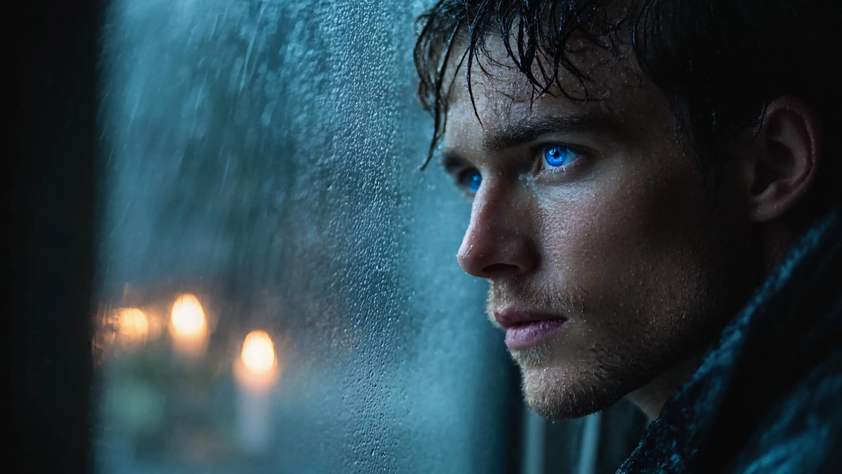 A man with striking blue eyes gazes out a rain-soaked window. His wet hair sticks to his forehead as he watches the torrential downpour outside. The window reflects the faint glow of candles, casting a soft light that contrasts with the dark, rainy night.