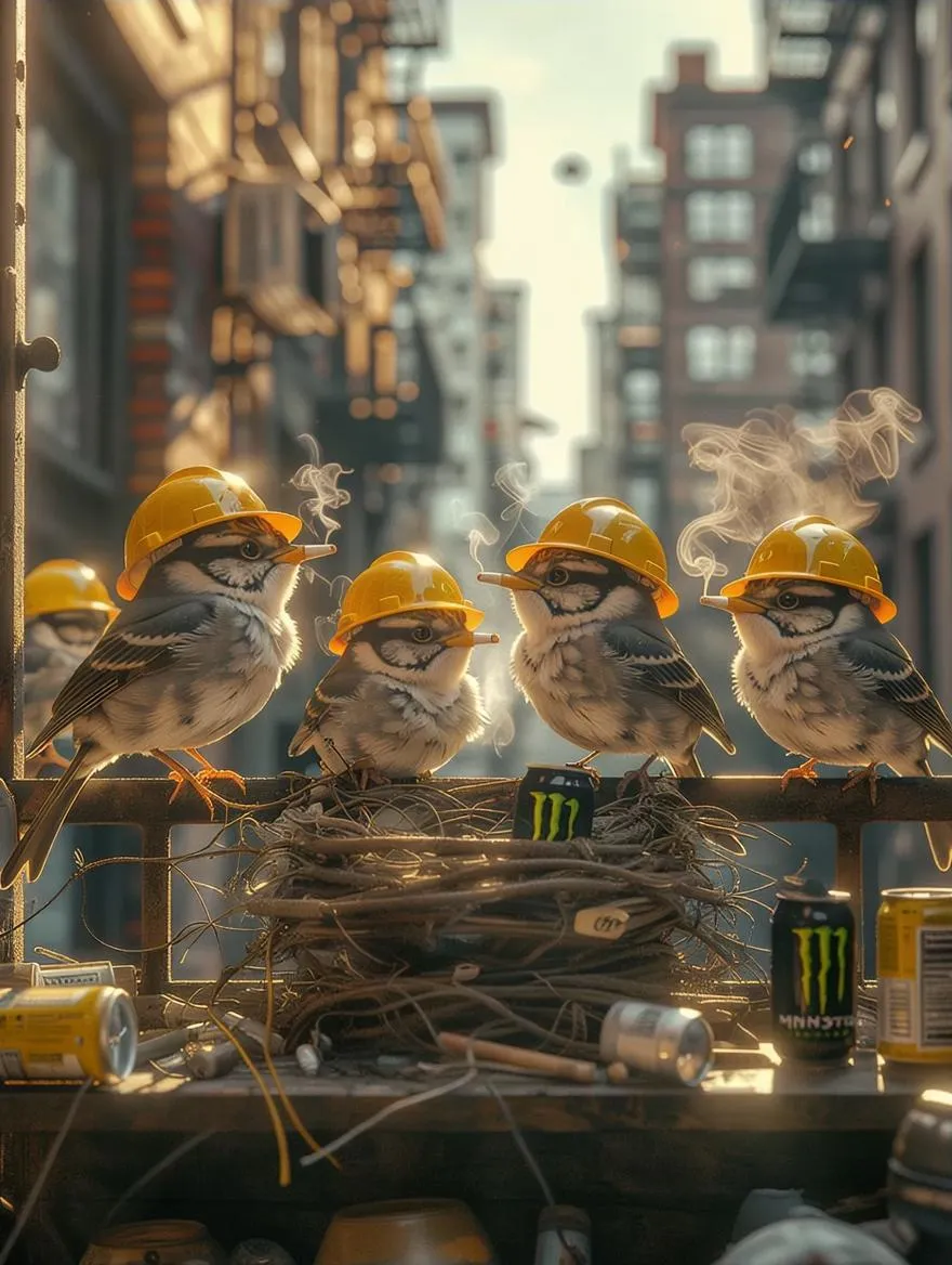 AI-generated surreal illustration of construction-hatted birds building chaotic nests on a cluttered urban balcony. Golden hour lighting highlights hyper-detailed feathers, miniature tools, and gritty debris against soft-focus high-rises. Combines cinematic realism with absurd humor in professional-grade AI art. Create expressive urban wildlife scenes through advanced text-to-image generation and curated editing tools.