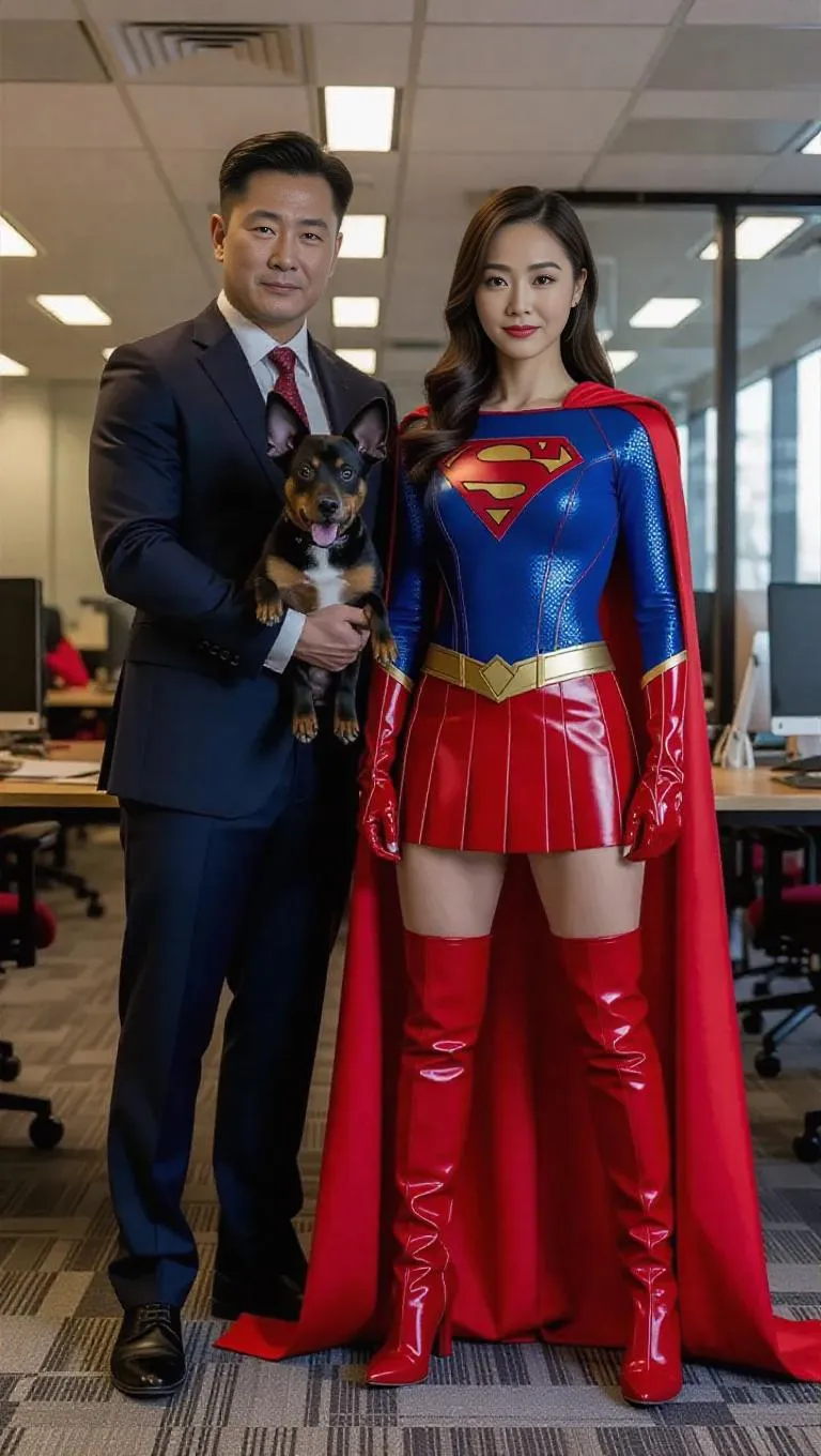 Generate an AI image of a dog-headed businessman in a suit and a Superwoman-styled female CEO discussing a deal in a panoramic office. Show full-body shots with confident stances and detailed outfits using VivaGo.ai's advanced AI tools for lifelike visual content creation from text prompts.