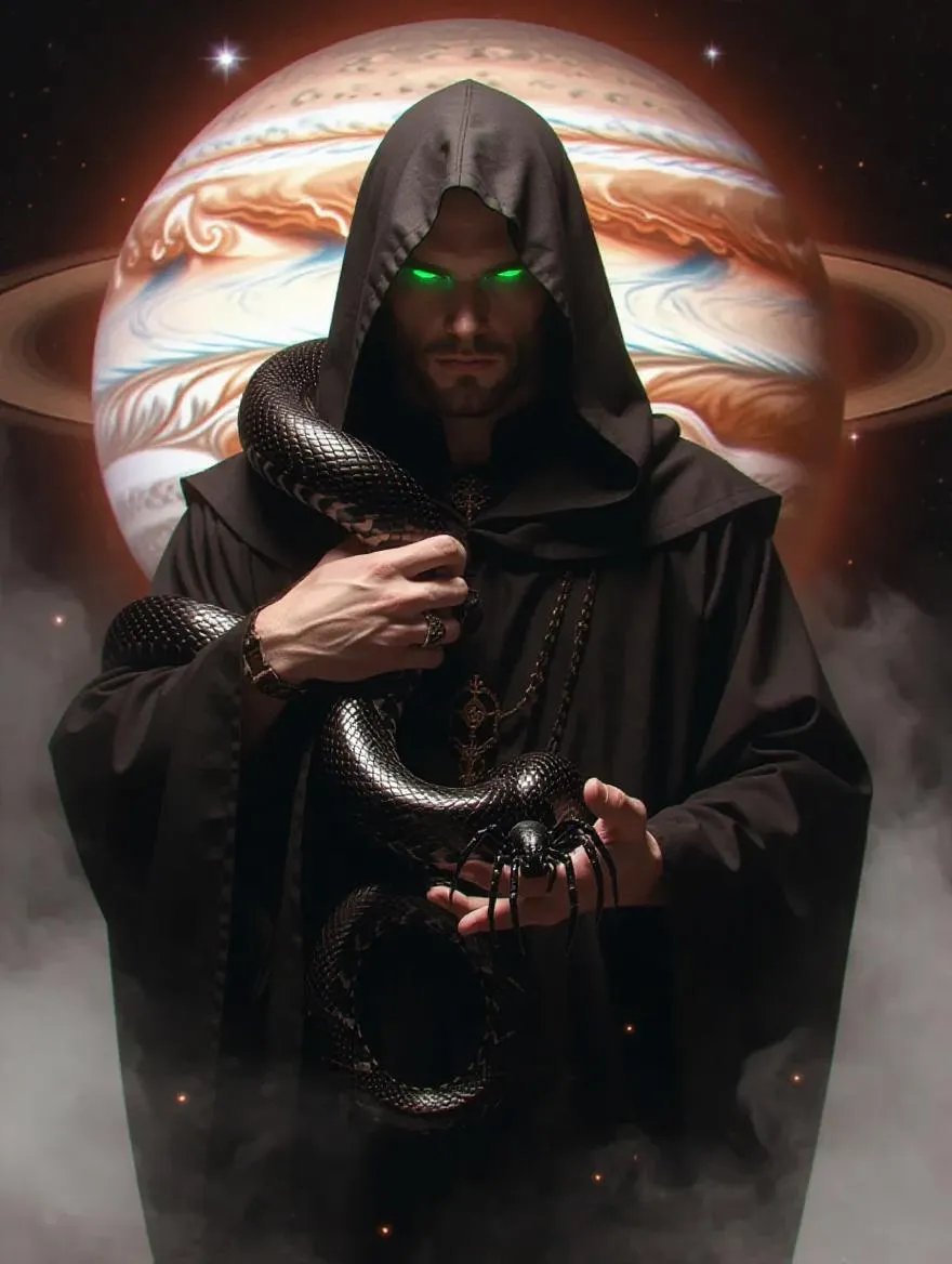Craft a hyper-realistic AI portrait of a mysterious European sorcerer: black robe, glowing green snake eyes, muscular build. Holds a black anaconda and tarantula against Jupiter's swirling clouds. Featuring grey smoke, red incense, and stunning planetary lighting. Discover eerie & detailed imagery with VivaGo.ai's AI generation tools.