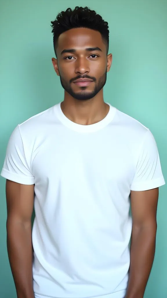 Generate a half-length portrait of a man in a crisp white T-shirt against a refreshing mint green background. This casual, relaxed vibe creates beautiful contrast and a clean, pure visual texture. Powered by vivago.ai's AI image tools for professional results.