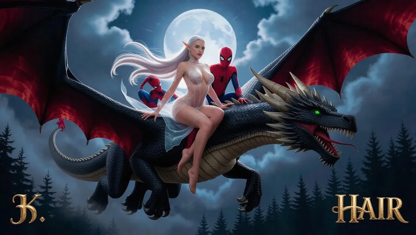 score_9, score_8_up, score_7_up, an elven girl with long white hair, pointy ears, and glowing green eyes rides a shimmering silver dragon high above a mystical forest. Her transparent, sheer dress reveals underboob and sideboob, her glowing skin bathed in soft moonlight, accentuating her hourglass figure and large breasts. Beside her, Spider-Man clings to the back of a massive obsidian dragon, his red-and-blue suit rippling in the wind. They soar together through clouds of mist and ancient magic, surrounded by ethereal light and glittering stars. The mood is surreal, sensual, and heroic. NSFW, fantasy art, highly detailed, high contrast, film grain, 8k. Cinematic aerial wide shot, camera glides sideways through the sky.