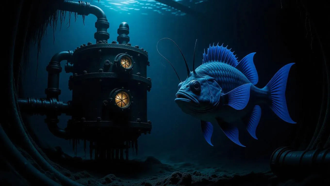 Sinking through the murky darkness, a school of grotesquely mutated fish, their scales a deep, iridescent blue, dart and weave around a decrepit, rusted underwater laboratory, its pipes and machinery covered in slimy, glowing tendrils of seaweed, as a lone, bioluminescent anglerfish, its face twisted into a macabre grimace, swims ominously into the foreground, its lure on top of its head pulsing with an otherworldly energy, casting an eerie, flickering glow on the surrounding wreckage.