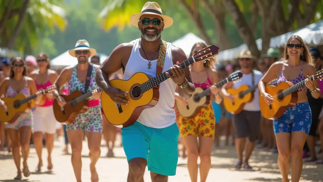 Vibrant AI-generated samba scene: Musicians play cavaquinho and pandeiro under golden sunset light, dancers sway in tropical dresses and colorful skirts. Detailed textures, authentic Brazilian neighborhood vibe with plastic chairs, beer cans, and festive banners. Realistic summer energy, cultural joy, and dynamic motion captured through AI image generation. Transform prompts into lively celebrations of rhythm, color, and community spirit.