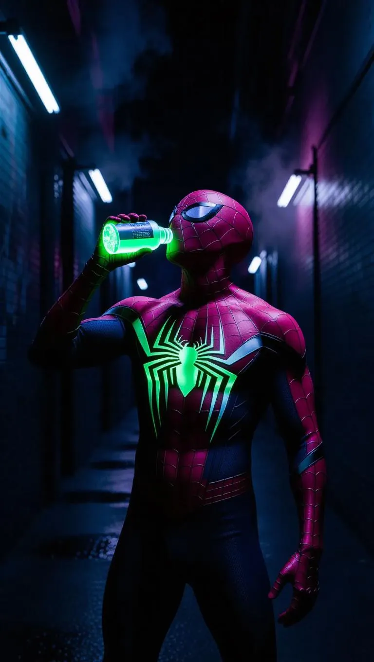 “A muscular male Spider-Man stands alone in a dark alley, surrounded by neon-lit walls and rising mist. He lifts a small glowing bottle to his mouth — the liquid inside pulses with intense blue-green light, casting reflections across his mask and suit. As he drinks, the radiant fluid glows even brighter, illuminating his chest and fingers through the red web-patterned fabric. The background fades into soft bokeh while the glowing drink becomes the focal point. Cinematic atmosphere, gritty texture, and sci-fi lighting make the moment surreal.” ⸻ Style & Detail Add-ons: cyberpunk alley, cinematic lighting, neon glow, glowing liquid, reflections on mask, gritty realism, highly detailed, high contrast, film grain, soft smoke, 4K