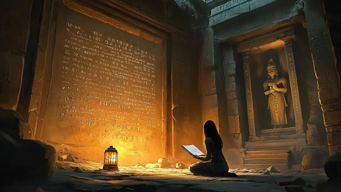 AI-generated anime art brings Irina's archaeological quest to life in a cinematic watercolor scene. Ancient half-sunken temple hall, glowing glyphs, dusty idols, and shifting hidden doorways rendered with mythic detail. Vivago.ai crafts immersive visuals blending warm lighting, cracked stonework, and ethereal storytelling.
