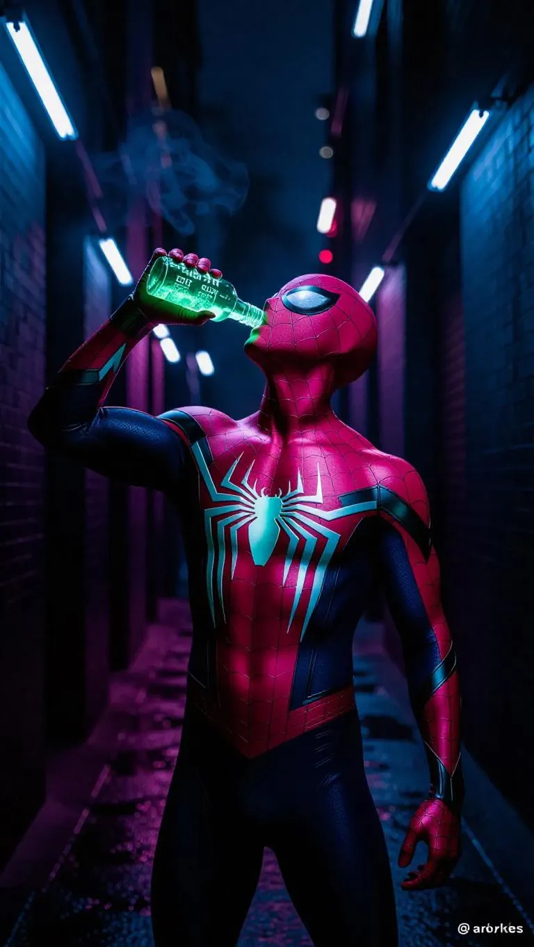 “A muscular male Spider-Man stands alone in a dark alley, surrounded by neon-lit walls and rising mist. He lifts a small glowing bottle to his mouth — the liquid inside pulses with intense blue-green light, casting reflections across his mask and suit. As he drinks, the radiant fluid glows even brighter, illuminating his chest and fingers through the red web-patterned fabric. The background fades into soft bokeh while the glowing drink becomes the focal point. Cinematic atmosphere, gritty texture, and sci-fi lighting make the moment surreal.” ⸻ Style & Detail Add-ons: cyberpunk alley, cinematic lighting, neon glow, glowing liquid, reflections on mask, gritty realism, highly detailed, high contrast, film grain, soft smoke, 4K