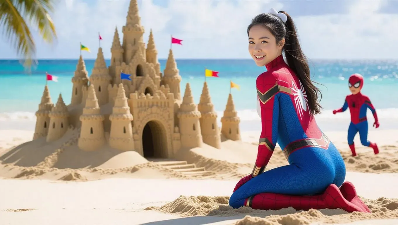 Spiderman and a beautiful Japanese woman in her 20s, wearing a white bikini, kneels on a tropical beach. Her back and hips face the camera, smiling brightly as she turns her head slightly over her shoulder. Long black hair in a high ponytail with a white ribbon. Focus on her smooth back, curved hips, and cheerful expression. Large, intricately detailed sand castle with turrets, arches, and carved textures casting soft shadows on the golden sand. Castle newly built, slightly damp, glistening in the midday sun. Baby boy and girl in Spiderman suits running nearby. Sparkling ocean, swaying palm trees, soft clouds, warm natural light. Cinematic, realistic, joyful scene. Ultra-realistic style, photo-quality textures, high detail, 4K resolution.