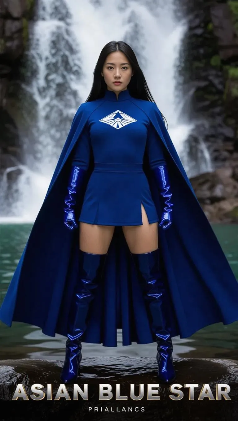 Generate stunning AI images of Asian superhero 'Blue Star' – a Chinese heroine in deep blue bodysuit with terrain emblem, cobalt gloves, cape, and boots. Flying aerial shot with panoramic waterfall backdrop from Vivago.ai's AI art generator. Transform text prompts into detailed superhero visuals.