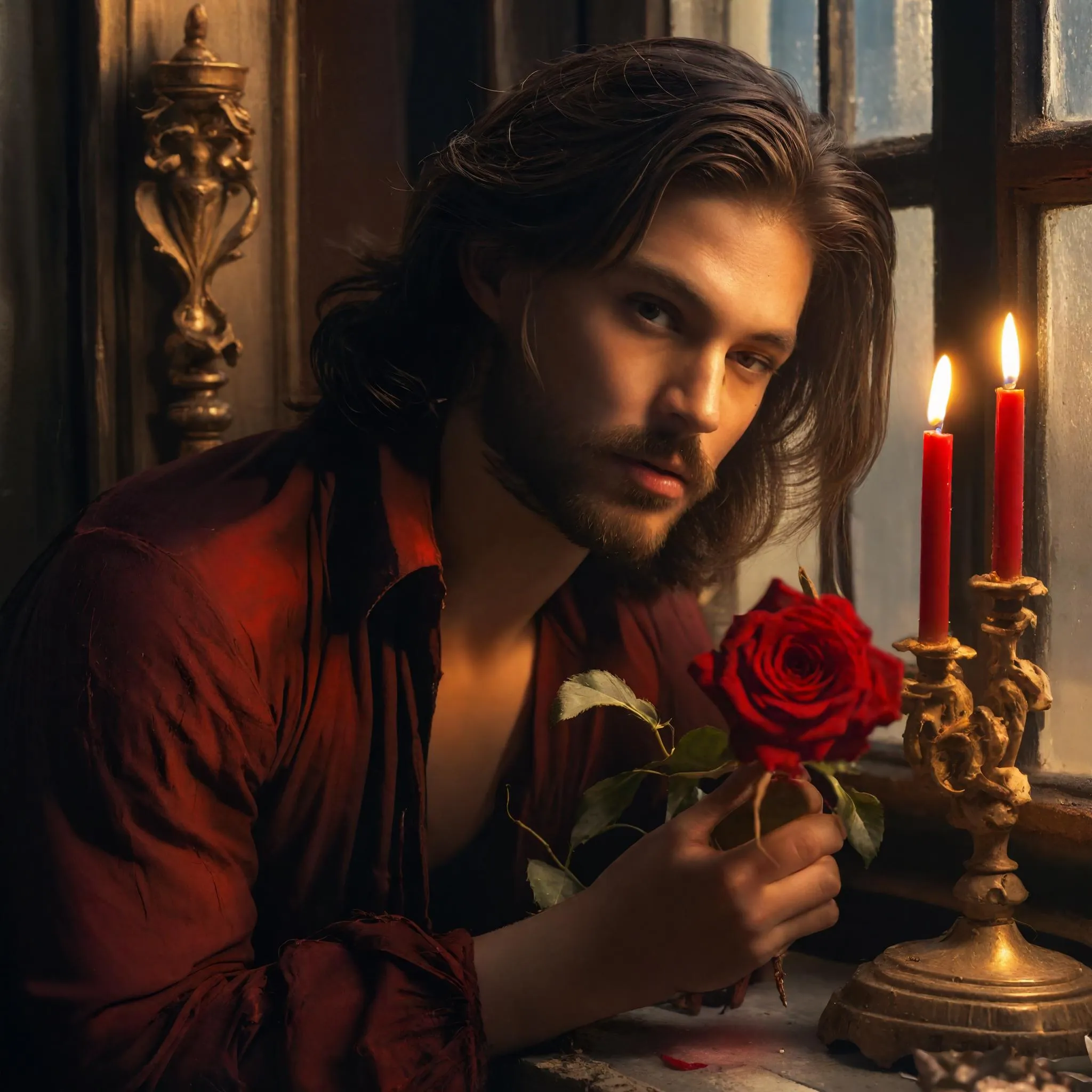 Un uomo con i capelli lunghi e la barba è seduto alla finestra, con una rosa rossa in mano. Nelle vicinanze, due candelabri dorati contengono candele accese, che proiettano una calda luce sul volto dell'uomo. La finestra è decorata con vernice scrostata, il che suggerisce che potrebbe essere vecchia o rovinata dal tempo. L'abito dell'uomo non è completamente visibile, ma sembra indossare una camicia nera. Sul davanzale della finestra, c'è un singolo vaso d'oro, parzialmente nascosto dal braccio dell'uomo. L'atmosfera generale dell'immagine è di tranquilla introspezione o riflessione. Luci in penombra stile Caravaggio
