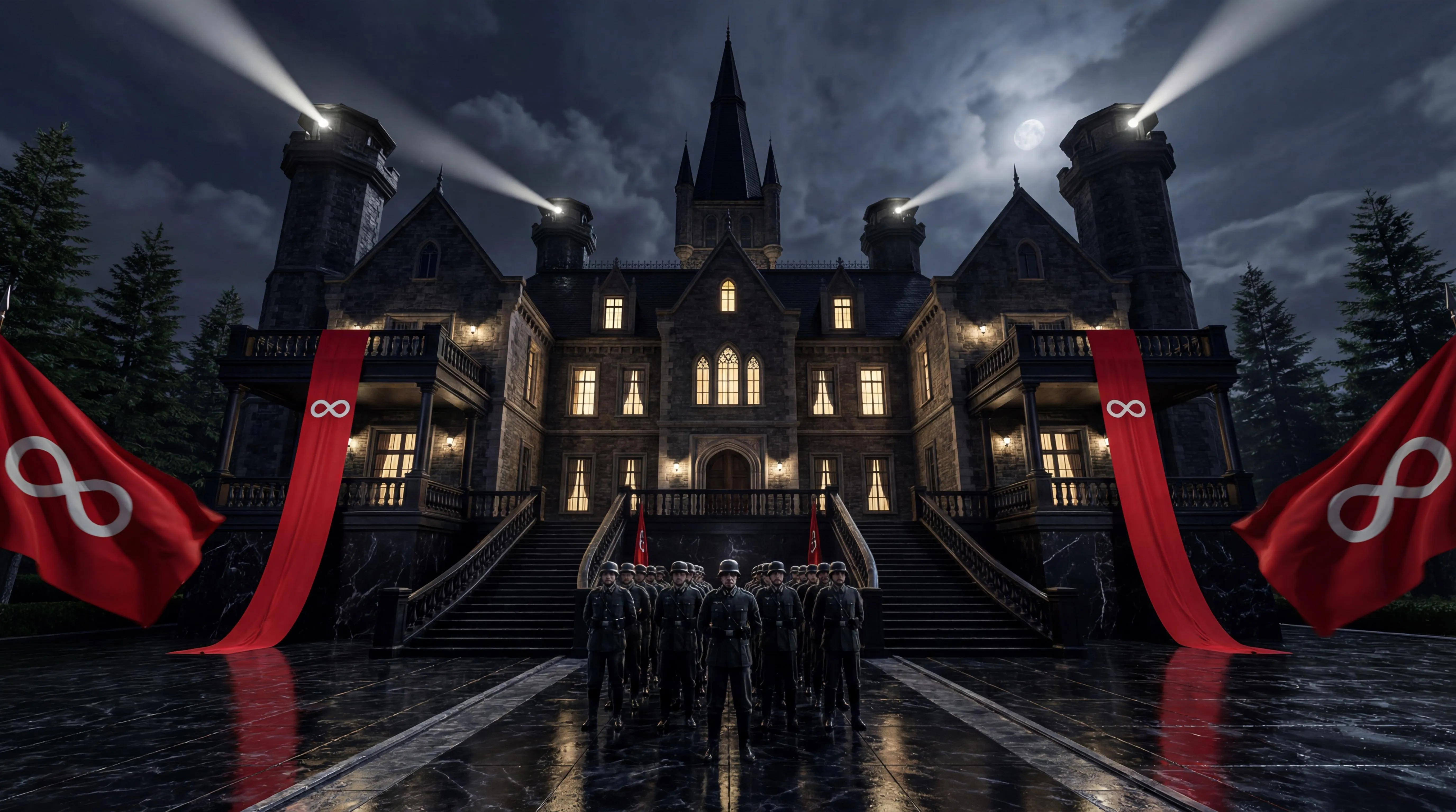Create stunning AI-generated night scenes of a Gothic infinity mansion with dramatic red canvases, towering black spires, and searchlights. Generate images featuring a company of 1940s German soldiers on wet marble walkways amidst fluttering infinity flags. Design your own haunting, atmospheric visuals with Vivago.ai's powerful image generation tools.