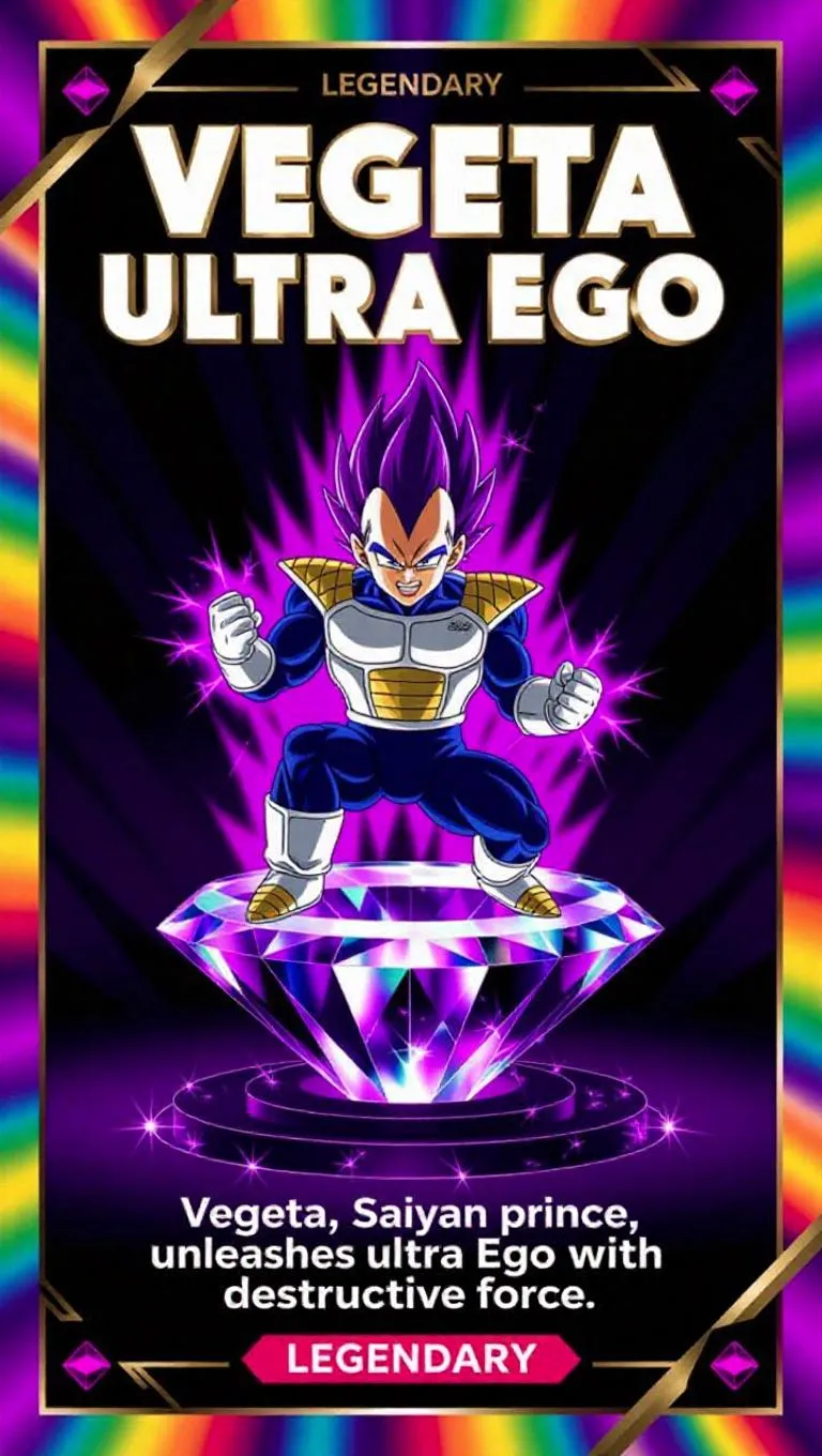 A trading card with a holographic rainbow slim elegantly border. Top half: Vegeta Ultra Ego on a crystalline diamond pedestal with holographic rainbow reflections, powering up, purple hair shining, intense purple aura flaring, battle-worn armor cracked, energy sparks glowing. Above head: "Vegeta Ultra Ego" in 3D bold white text, golden frame, ruby gems. Slightly below mid-card: White text with shadow inside a rainbow frame, carbon interior: "Vegeta, Saiyan prince, unleashes Ultra Ego with destructive force." Below text: "LEGENDARY" in RAINBOW font. Background gradient: A 3D brilliant rainbow color. #High Detail,Hyper Quality,High Resolution,16k Resolution