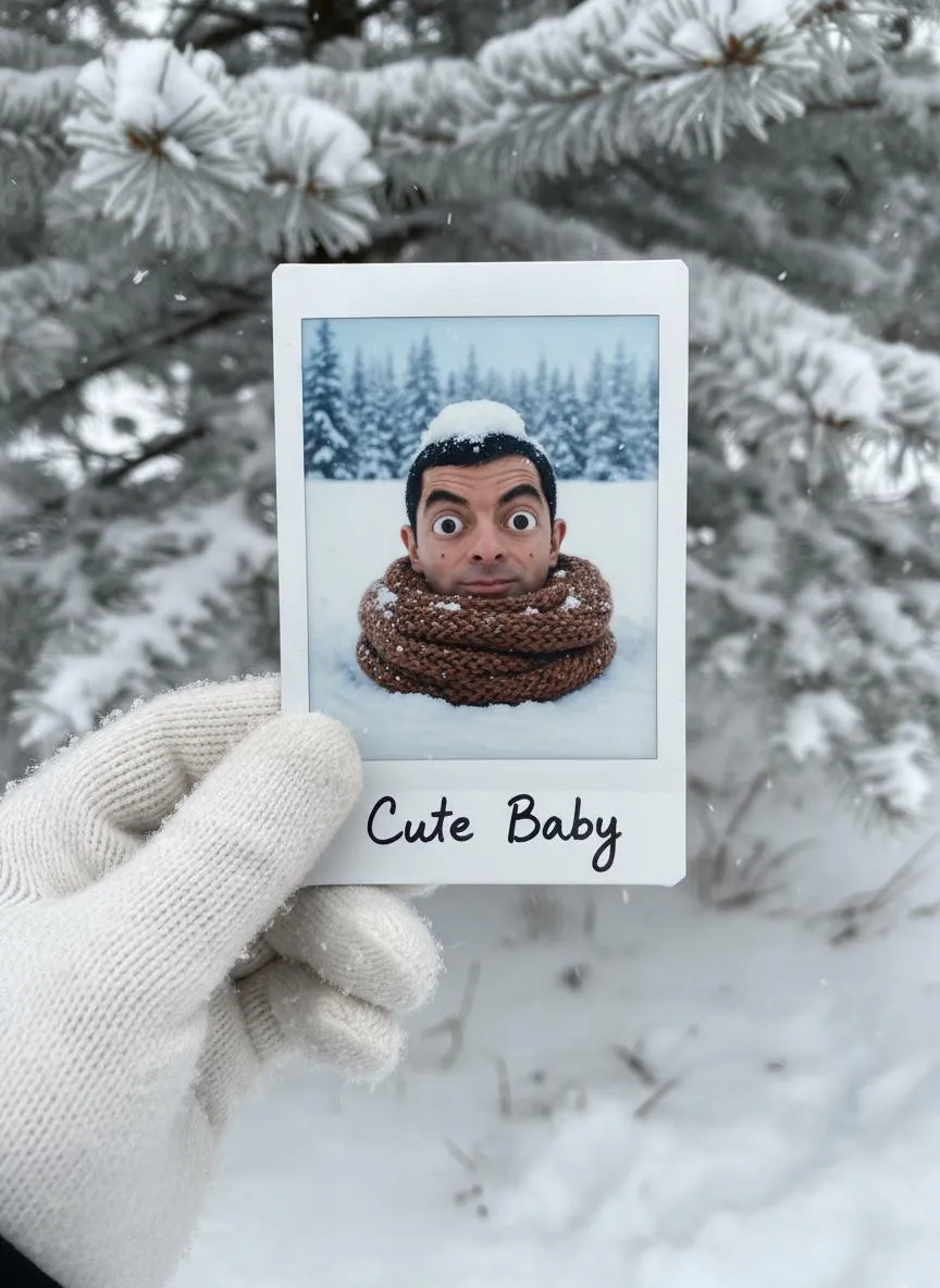 上传的图中形象(特征不变),趴卧在冬天的雪地上,表情无辜呆萌;脖子上围着一条棕色粗针织质感的围巾,头顶轻轻放着一堆积雪;背景是雪地和松树,周围弥漫着清冷的色调和浪漫的雪花粒子光斑;画面呈现为“一只手(戴白色针织手套)拿着白色拍立得相纸”的特写近景构图图片,相纸内显示上述形象和场景,相纸底部印有艺术感手写字体“Cute Baby”,相纸外显示为上述冬季松树和雪地场景;整体风格为温暖治愈的冷色调,带有胶片质感的高清细节,营造出温馨的冬日童话氛围