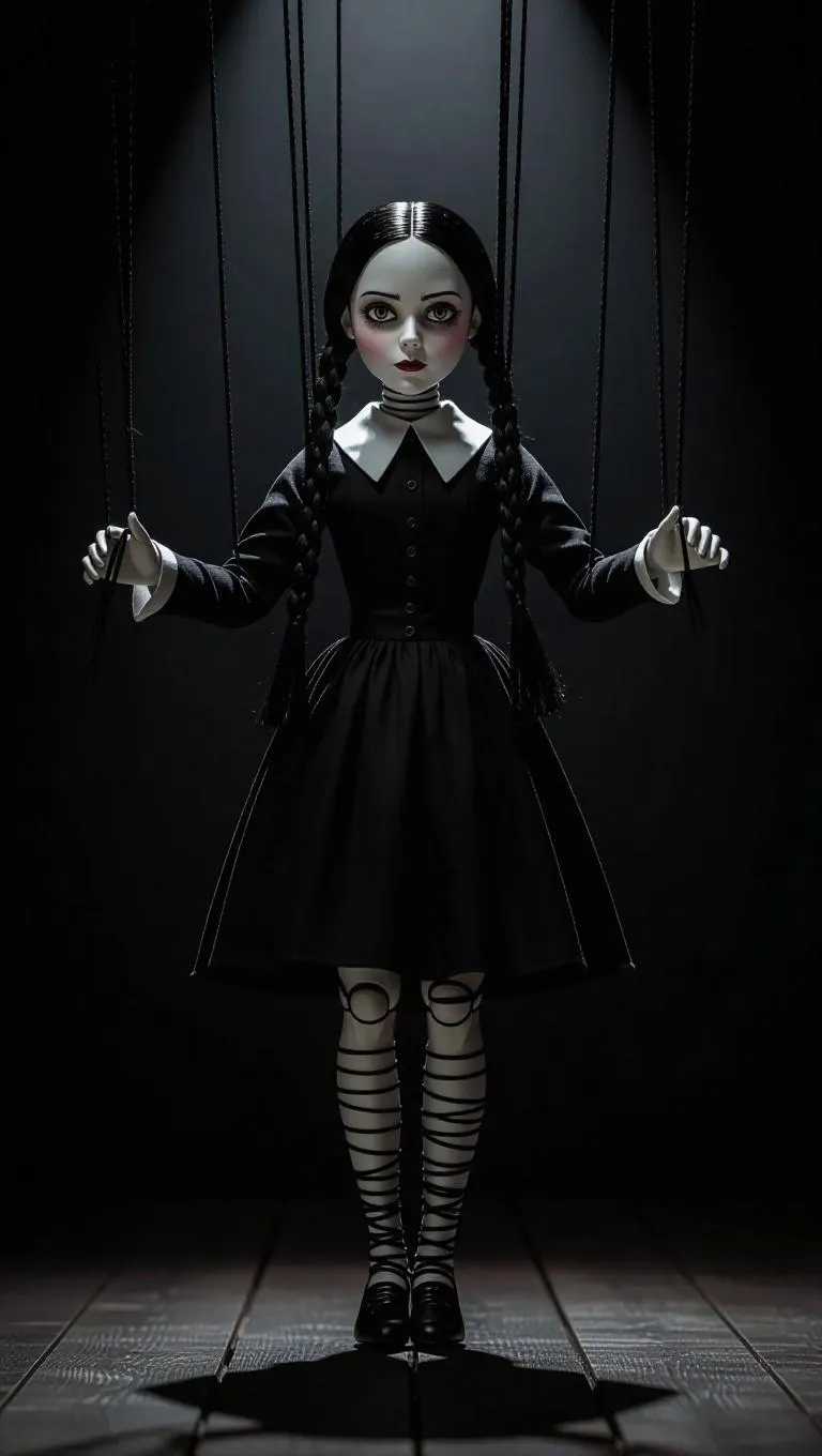 AI-generated gothic marionette inspired by Wednesday Addams: pale skin, black braided hair, short black dress with white collar. Thick controlling ropes highlight eerie elegance and mechanical movement in dark ambiance. Craft haunting AI visuals with vivago.ai’s image generator for uncanny character art, porcelain-textured details, and dramatic shadowplay in minimalist dark fantasy settings.
