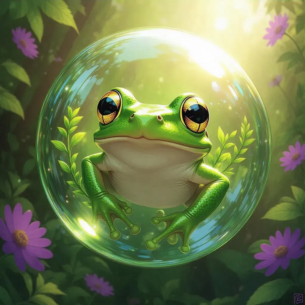Dream Bubble art style, Frog with bright green color palette, whimsical and surreal, floating in a luminous bubble, surrounded by ethereal light and vibrant flora, creating a magical and enchanting atmosphere.