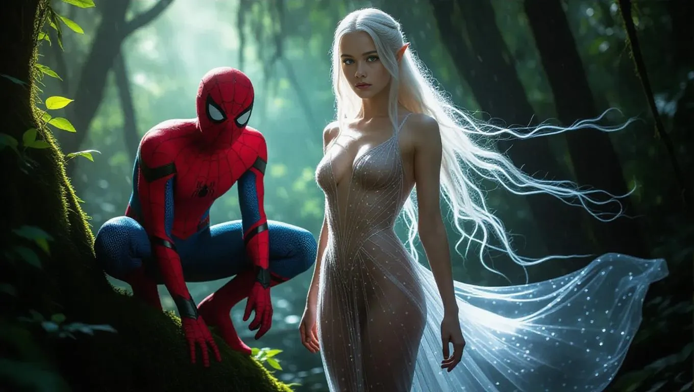An elven girl with long white hair and glowing skin stands in a mystical forest, her sheer, see-through dress flowing around her hourglass figure. Her green eyes shimmer under soft ambient light. Beside her, Spider-Man crouches heroically on a mossy tree branch, his red-and-blue suit gleaming with rain-kissed highlights. Ethereal bioluminescent flora illuminate the forest, creating a pulsing, otherworldly ambiance. Sensual, enchanted, high contrast, ultra-detailed fantasy art style, film grain, 8K resolution, cinematic wide shot, camera glides slowly sideways.