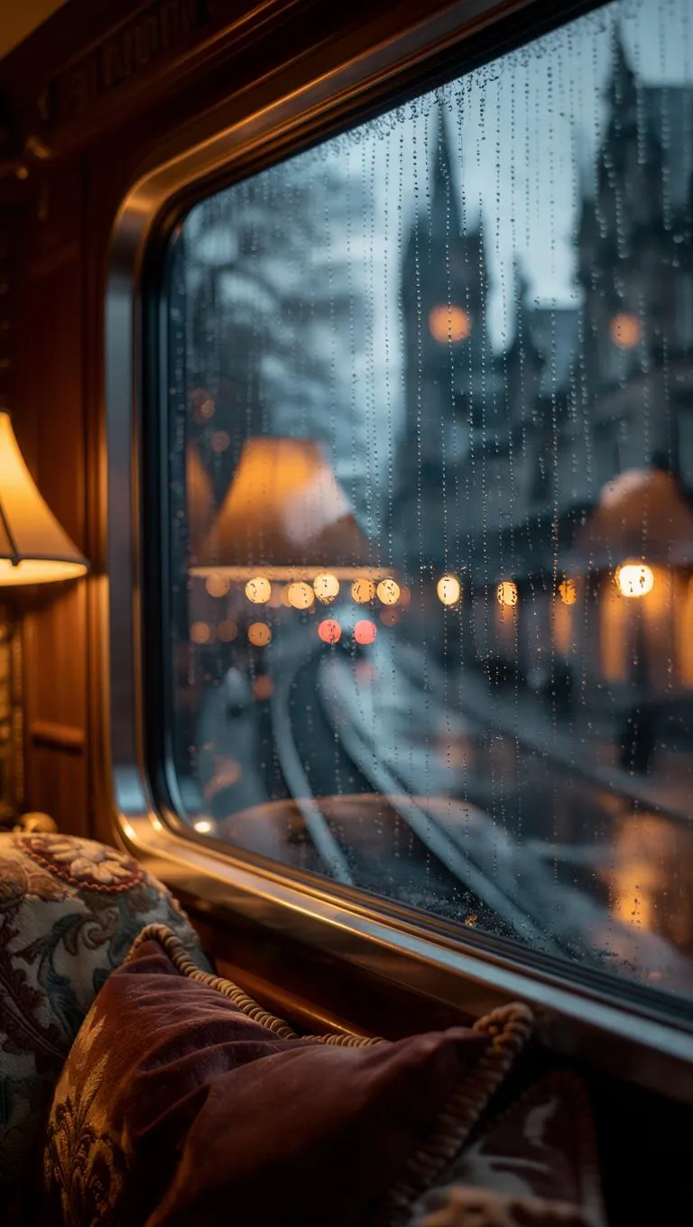 Ultra-realistic cinematic scene inside a luxurious vintage train at night. Camera at seat level frames a velvet-lined interior with warm ambient lighting, polished wood, and a softly glowing reading lamp. Outside, rain trickles down the window as the train glides through a blurred, gothic European cityscape—spires, glowing windows, and flickering streetlamps melt into bokeh. Light reflections shimmer on glass, creating a dreamlike contrast between cozy elegance inside and the rainy, poetic night outside. 16:9 frame, soft rain FX, subtle movement, moody atmosphere—evoking nostalgia, solitude, and timeless luxury.