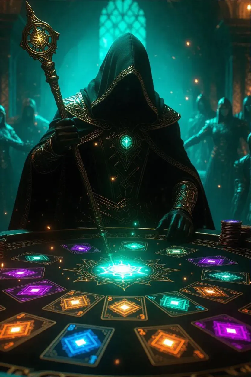 A lone, hooded figure wielding a staff adorned with glowing, ethereal runes, casting a spell of protection, stands prominently in the foreground, surrounded by a halo of soft, blue-green luminescence, as a majestic, ornate card game table stretches out behind, covered in scattered, intricately illustrated cards of varying rarity, including legendary, epic, and rare cards, distinguished by faction symbols and vibrant colors - gold, crimson, and midnight blue - while mana and energy costs are displayed in a subtle, arcane script, all rendered in a dark, gothic fantasy horror style.