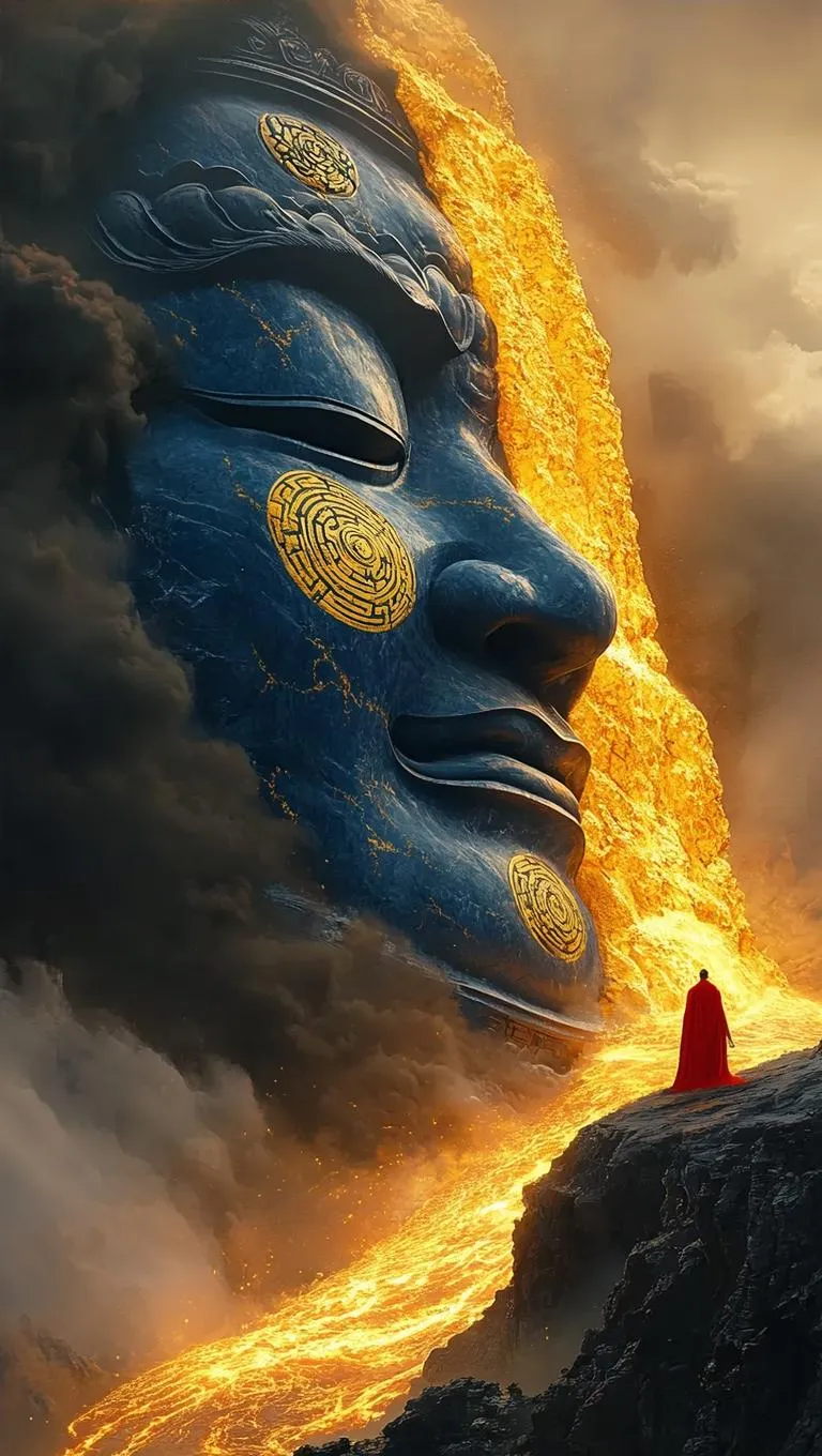 Epic mythological digital art featuring a dark blue ancient Chinese tripod-vajra fusion face with golden Bagua patterns, engulfed by golden lava. Set in Danxia landform with a red-cloaked villain, high-contrast lighting highlights rock textures. Realistic, serious, and moving outdoor scene with sunrise mist, black fog, and dramatic full-frame close-up. AI-powered visual storytelling for professional-grade creativity.