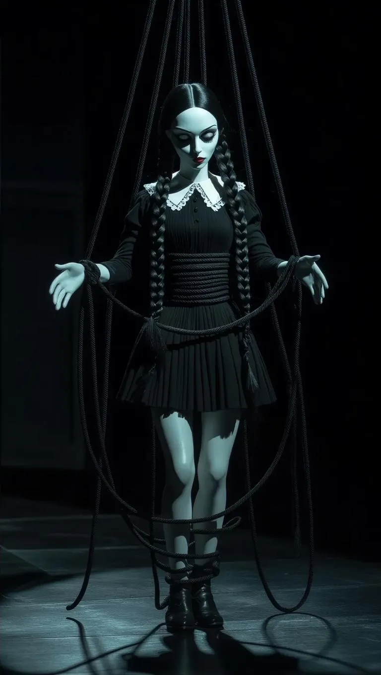 AI-generated gothic marionette inspired by Wednesday Addams: pale skin, black braided hair, short black dress with white collar. Thick controlling ropes highlight eerie elegance and mechanical movement in dark ambiance. Craft haunting AI visuals with vivago.ai’s image generator for uncanny character art, porcelain-textured details, and dramatic shadowplay in minimalist dark fantasy settings.