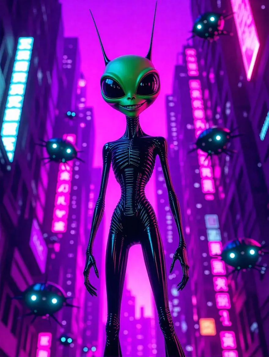 Alien, Invader Zim, standing confidently in a futuristic cityscape, neon lights casting a vibrant glow, with a mischievous grin and his iconic antenna, surrounded by advanced technology and floating drones, creating a surreal and dystopian atmosphere.