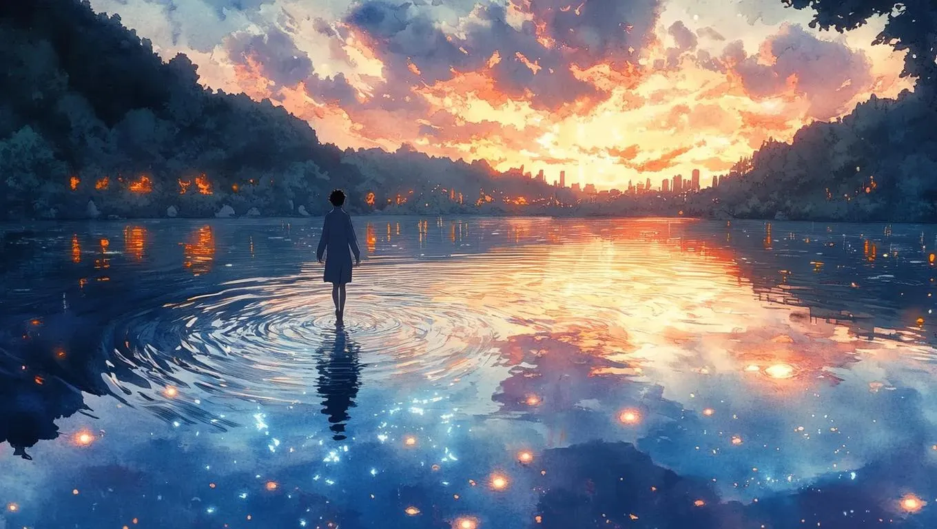 Create surreal watercolor anime scenes with AI: a luminous lake reflecting submerged memories, ethereal figures walking on rippling waters, and glowing visions of cities or lovers. Vivago.ai transforms prompts into dreamlike visuals with luminescent effects, soft textures, and quiet surrealism. Craft professional-grade AI art using curated styles and intuitive editing tools.
