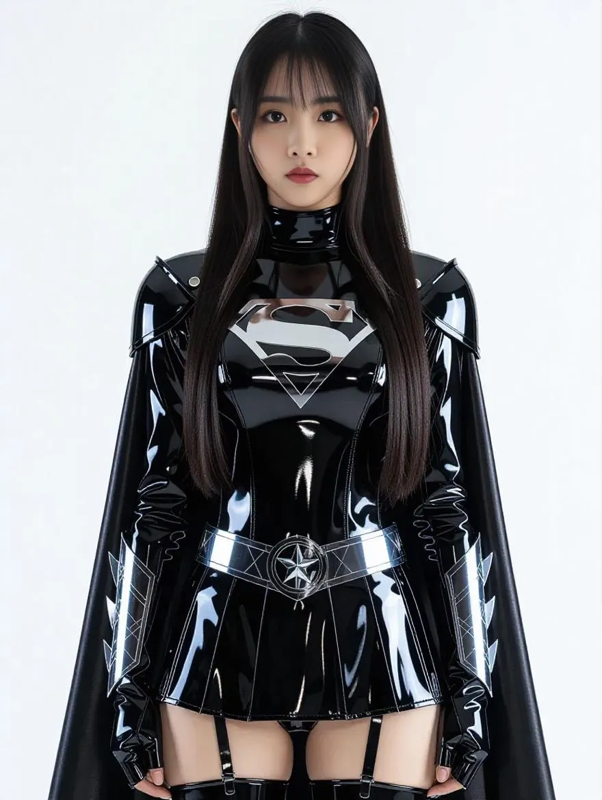 Transform text into a dynamic AI-generated superheroine with VivaGo.ai. Featuring a Chinese female college student in black patent leather PU tights, krypton fiber combat suit, silver diamond shield emblem, and dark star villain aesthetics. Full-body panoramic view, static pose, wide-angle lens, leg gap, and shoulder-width stance. Perfect for immersive character design and AI-powered visual storytelling.