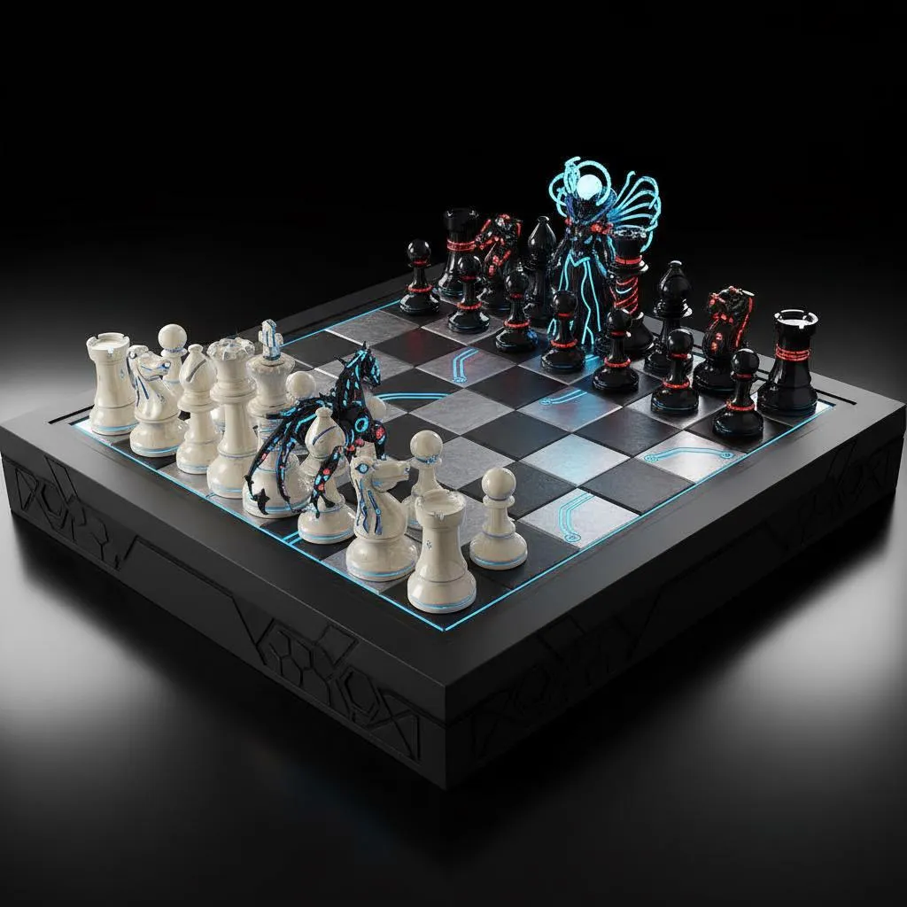 Design a 3D printable chess set inspired by the reference image. Create a full chessboard and unique chess pieces in a similar sci-fi style. Each piece should have detailed, futuristic design elements, with a balance between functionality for 3D printing and artistic style. The chessboard should have a sleek, modern look with engraved patterns, and the pieces should be clearly recognizable as pawns, rooks, knights, bishops, queen, and king, while maintaining the sci-fi inspiration. Output should be shown as 3D renderings suitable for 3D printing preview.