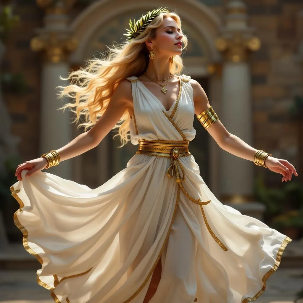 Stunning cinematic image of a graceful ancient Greek woman dancing in flowing white and gold robes, golden accessories, and olive leaf crown. Majestic, artistic, immersive historical epic film aesthetic with soft shadows, depth of field, and warm tones.