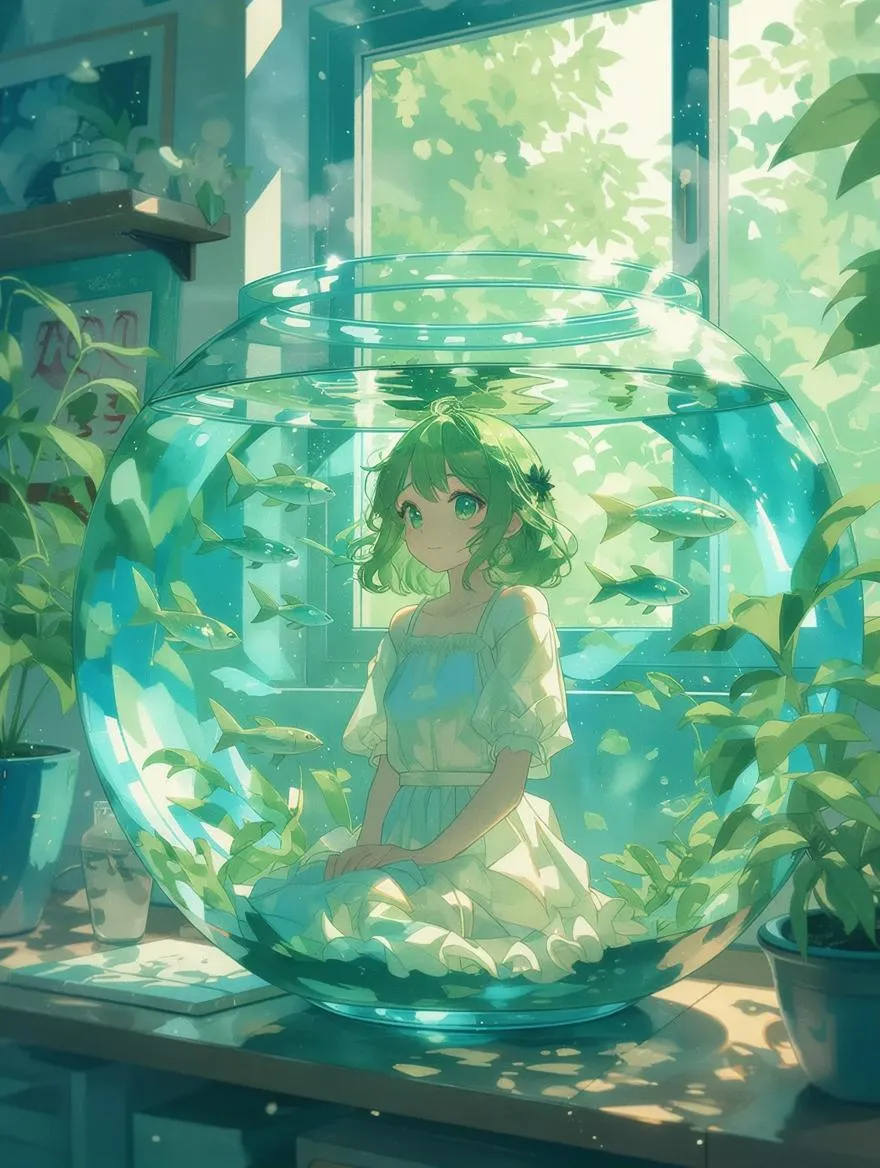 dreamy,summer heat by summer breeze,The background of the fishtank, the girl in the fishtank::1.05,fishtank on floor,and interior decoration, light green and light blue, in the style of anime art, romantic light, by James Jean