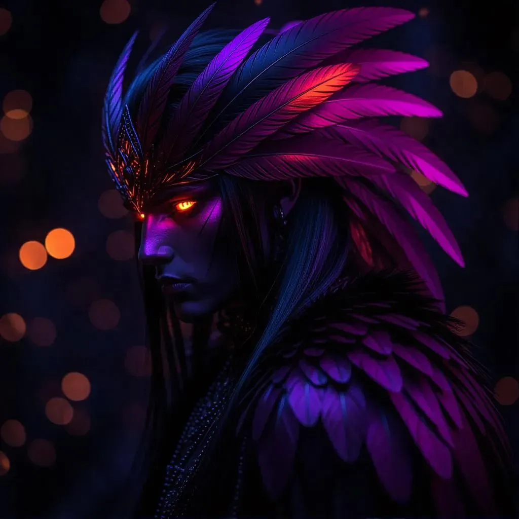 Create a dark fantasy character Abaddon with feather-textured hair in a striking black-purple, pink-red, and glowing orange palette using AI. Vivago.ai transforms text prompts into vivid visuals, offering advanced color blending and ethereal effects for mythical creature designs, anime-inspired art, and supernatural digital creations. Generate professional-grade dark fantasy imagery effortlessly.