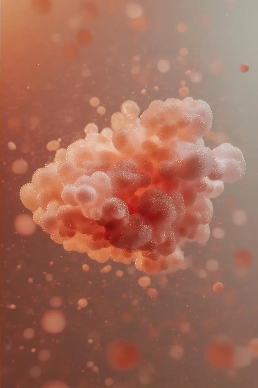 A surrealist photographic image of a single, isolated mound of grapefruit-colored foam, floating weightlessly in midair against a soft gradient background. The foam is dense and voluminous, glistening with hyper-real surface tension—each bubble reflecting ambient light with pearlescent highlights. Some larger bubbles sparkle subtly, like stars trapped inside soap. Shot in the style of high-end surrealist photography, with dramatic depth of field and cinematic soft lighting. The foam appears impossibly perfect—both organic and artificial—suggesting a dreamlike, tactile illusion. The overall tone is calm, ethereal, and slightly uncanny.