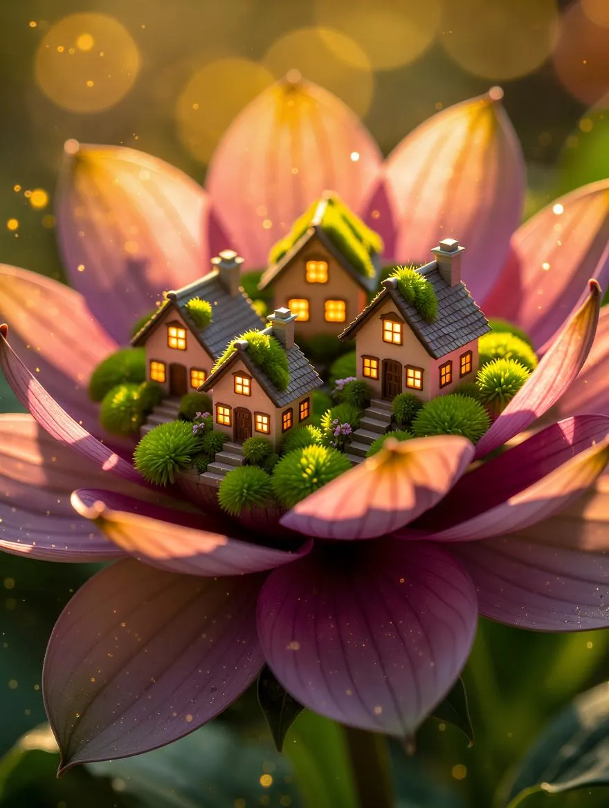 A hyper-detailed macro photograph captures a surreal miniature village perched atop a fully bloomed flower. Tiny, hand-crafted houses with moss-covered roofs nestle between vibrant petals, their windows glowing faintly. The flower's velvety texture and pollen grains appear monumental, with a soft-focus background bokeh enhancing the dreamlike atmosphere. Warm sunlight filters through translucent petals, casting golden highlights. The image blends botanical realism with whimsical architecture, creating a magical, fairytale-like scene where nature and scale are inverted, rendered with exquisite depth and artistic intimacy.