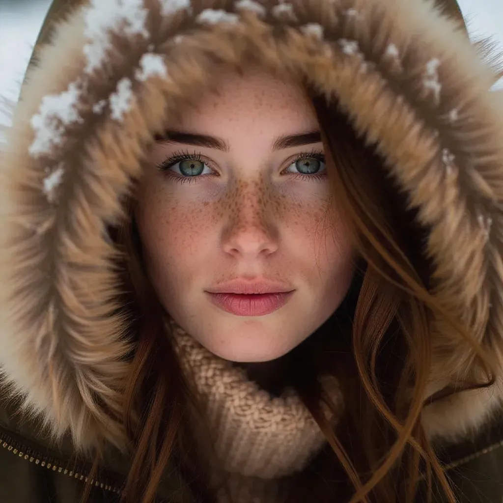 Petite and attractive european girl in her 20s. Long red-brown hair. freckles on face. Face surrounded by fur lined hood of a winter jacket.