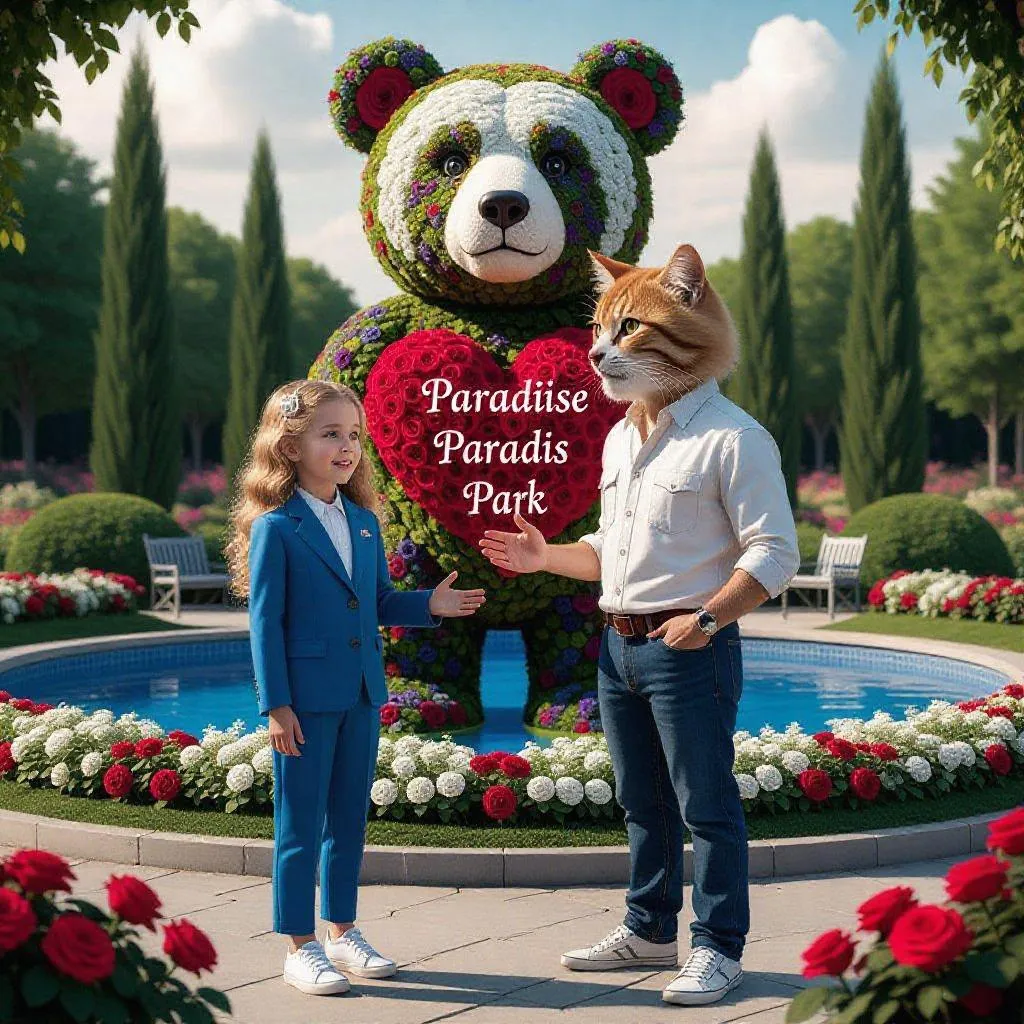 Create magical AI-generated visuals with VivaGo.ai: 3D paradise park scene featuring a blonde girl in formal wear and a cat-headed man, floral bear sculptures, serene pools, and lush greenery. Perfect for storytelling with natural daylight lighting, surreal characters, and professional-grade AI image generation tools.