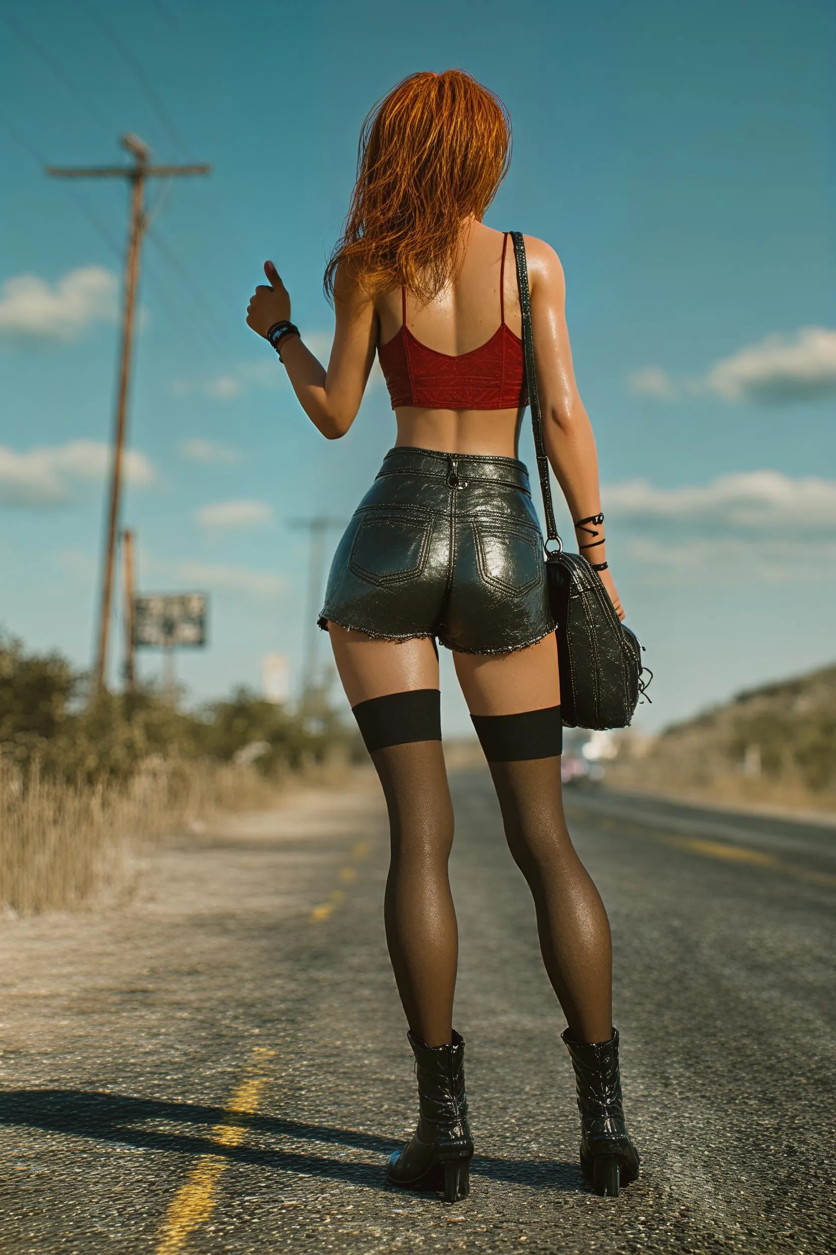Girl, very big tits, very short and tight leather shorts, camisole, stockings, Hitchhiking, sticking out a thumb on the side of the road, normal shape top to bottom, photorealistic