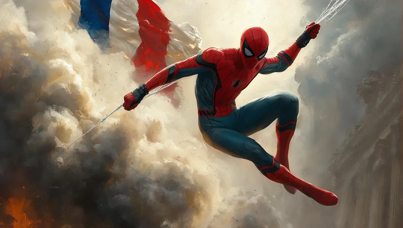 Create dynamic AI art merging Spider-Man with Delacroix's "Liberty Leading the People." Generate gritty, revolutionary scenes blending oil painting textures and photorealism. Vivago.ai transforms prompts into heroic chaos: web-slinging through smoke, tricolor flags, and allegorical symbolism. Unleash AI-powered creativity for iconic Marvel-historical mashups.