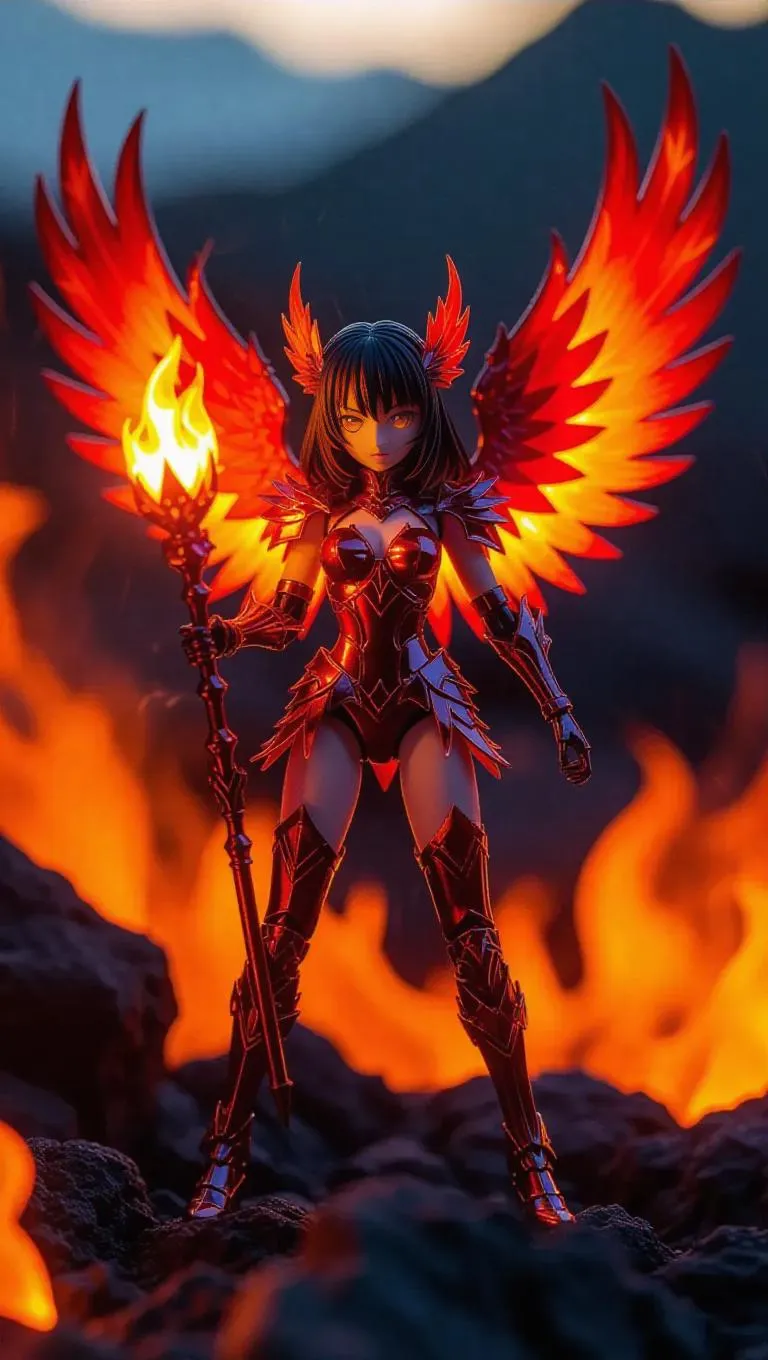 A magical girl action figure with sparkling phoenix wings that flame in different shades of orange and red in the light, wielding a fiery staff that ignites into flames when activated. Her eyes are shining with flame-shaped sparkles, and her outfit is a fierce mix of fire and ash. The toy box is designed with intricate flame motifs, set against a backdrop of a volcanic landscape glowing in the sunset. Style: Realistic with a fiery fantasy vibe.