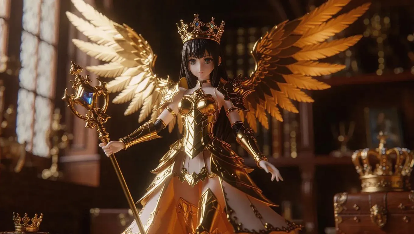 A magical girl action figure with majestic gold wings, a royal staff, and radiant eyes stands in a victorious pose. Her toy box is adorned with regal crowns and features her in an authoritative magical stance, complete with additional royal blast accessories. The background is an elegant toy workshop, suffused with rich, jewel-toned light that amplifies the colors and creates a luxurious atmosphere. Style: Realistic with a touch of regality.